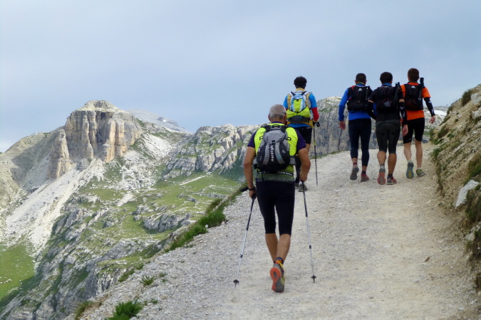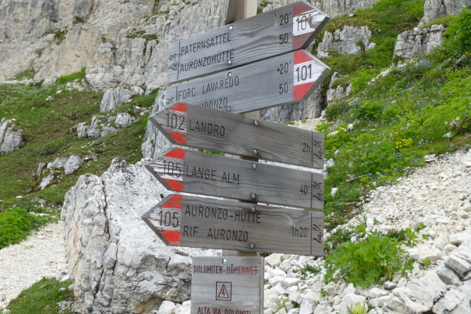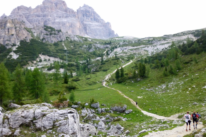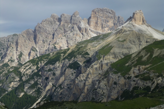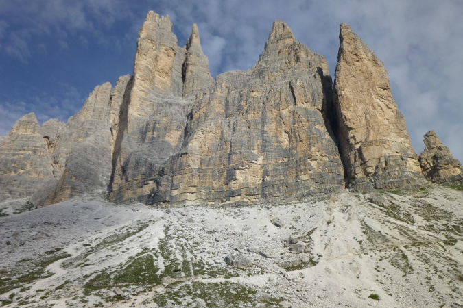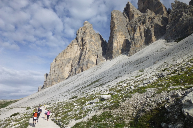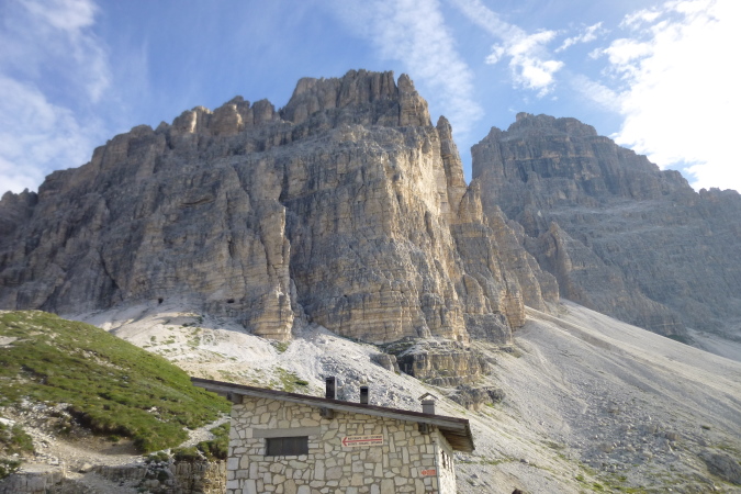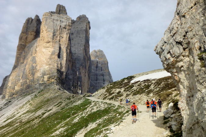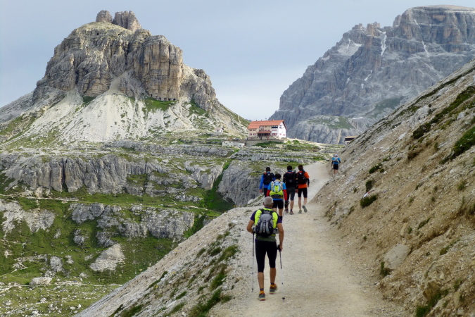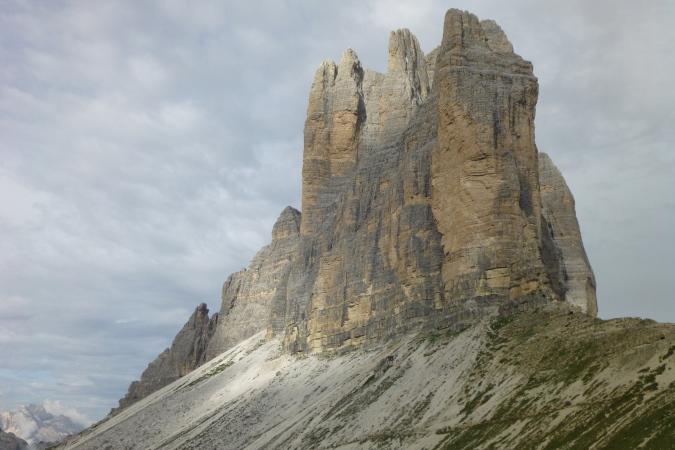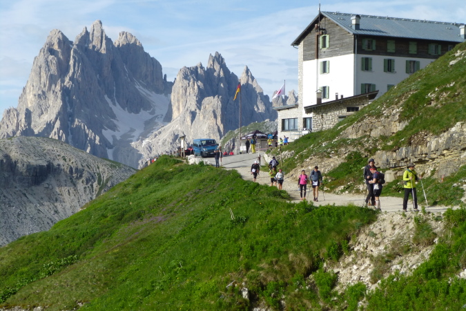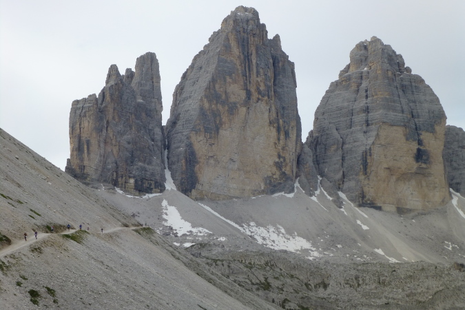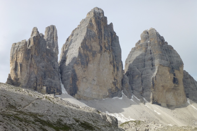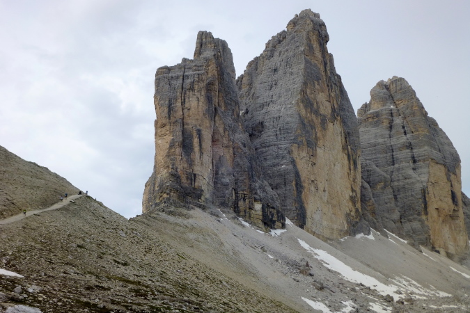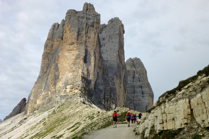 Getoppt wird das allerdings von dem, was man, dem Pfad langsam in die Tiefe folgend, bei einem Blick zurück erleben darf. Denn nun präsentieren sich die Drei Zinnen so, wie man es von unzähligen Fotos her kennt und erwartet: Als drei gigantische, einsamen Zacken. Beeindruckend ist vor allem die mittlere Cima Grande mit ihrer 500 Meter senkrecht abfallenden Nordwand, die als extraordinäre Herausforderung auch bei Bergsteigern hoch im Kurs steht.