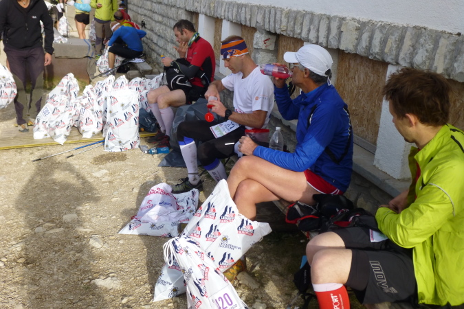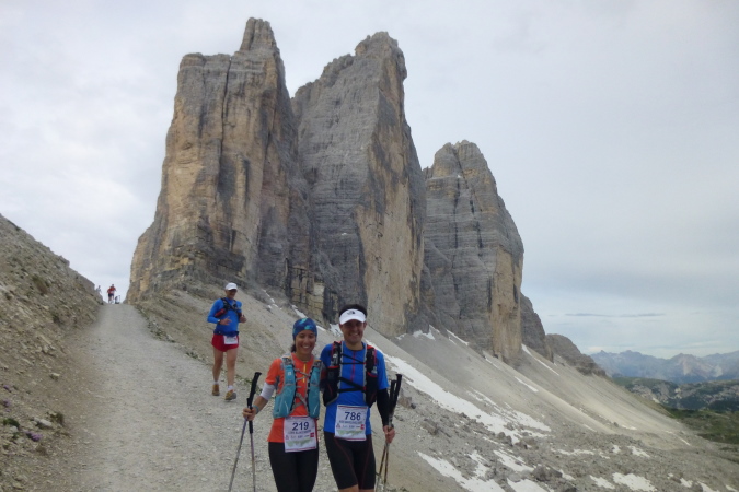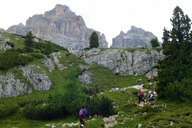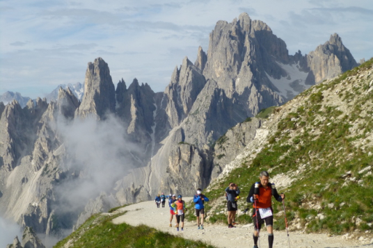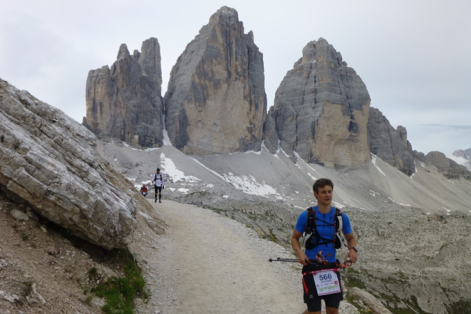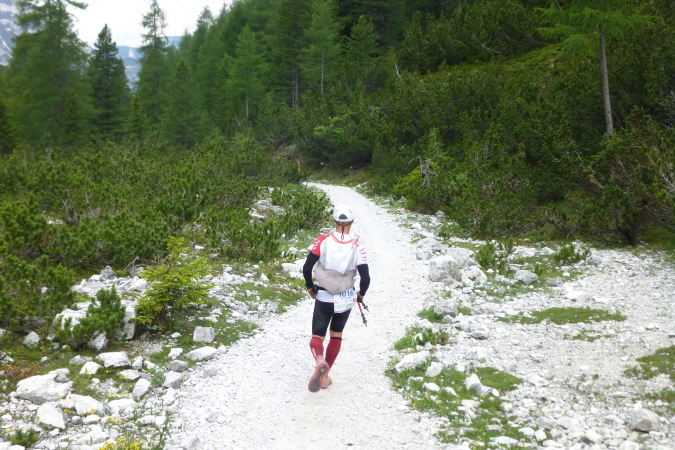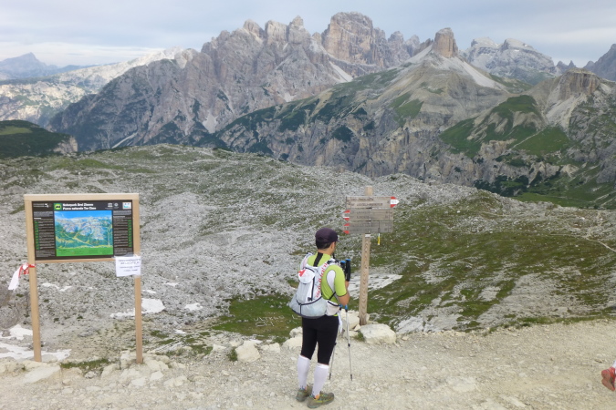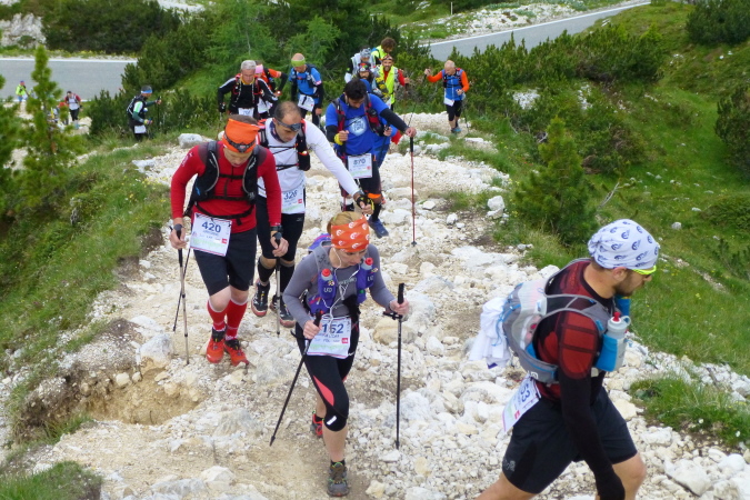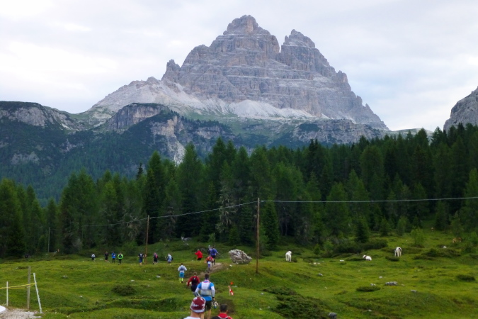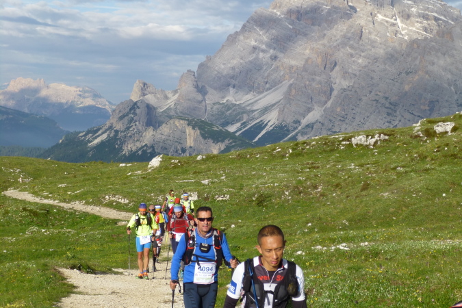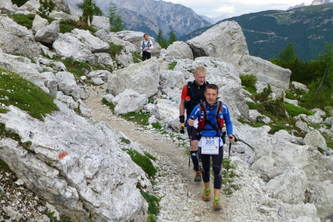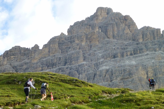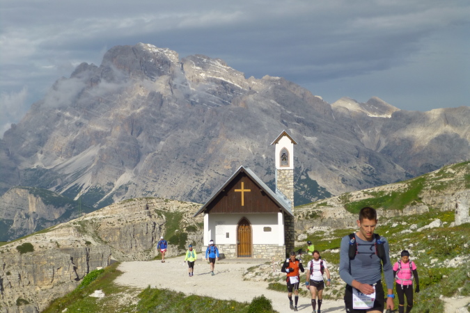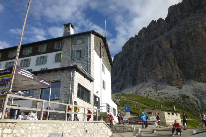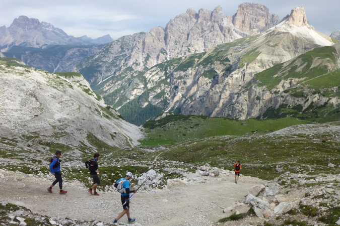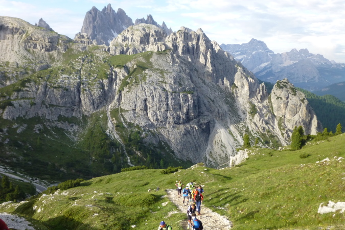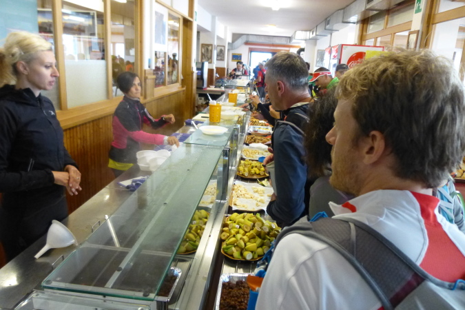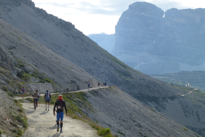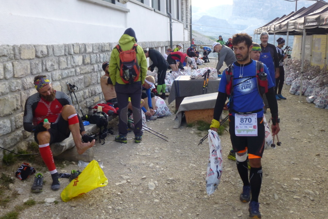 7:30 Uhr und damit drei Stunden vor dem Zeitlimit ist es, als auch ich das geräumige Schutzhaus erreiche und mich in das perfekt organisierte Durchschleuseprozedere einreihe. Konkret bedeutet das: Als erstes drückt man mir meinen in Cortina aufgegebenen Kleiderbeutel in die Hand. Ich brauche nichts und so bin ihn ein paar Meter weiter gleich wieder los. Erst dann werde ich direkt in das Innere des Rifugios gelotst und darf erst einmal Schlange stehen für eine heiß begehrte Suppe. Die ist zwar alles andere als haute cuisine, tut aber verdammt gut. Ansonsten umgibt mich hier ein Rummel wie in einer Skihütte zur Hochsaison. Neben dem schon bekannten Verpflegungsprogramm ist aber selbst ein Cappuccino an der Bar drin. Lange hält es mich dennoch nicht. Denn die Bergwelt draußen ist einfach ….. sensationell. Kurz piept die Zeiterfassung am Hüttenausgang. Und mich erwartet der wohl spektakulärste Abschnitt des Trails.