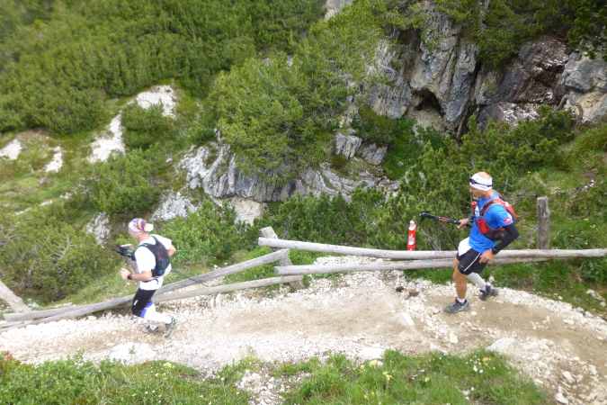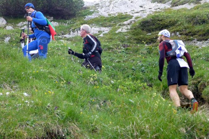 Den Weg dorthin müssen wir uns läuferisch hart erarbeiten. Wobei Laufen zumeist nicht das Gebot der Stunde ist. Auf ausgesetzten, gerölligen Pfaden hieve ich mich mit massivem Stockeinsatz über Almen und durch Fels. Schnell gewinnen wir an Höhe. Je höher ich komme, desto öfter muss ich innehalten und durchschnaufen. Aber jeder Stopp belohnt mich zumindest mit einem wunderbaren Blick auf das sich wandelnde Bergpanorama. Weit vor und hinter mir sehe ich bisweilen die Läufer als bunte Punkte durch die Bergwelt schleichen.