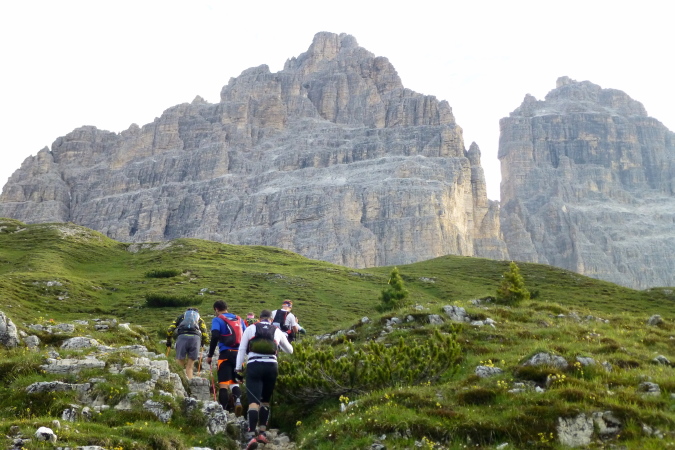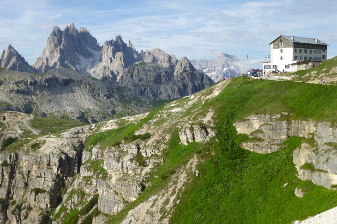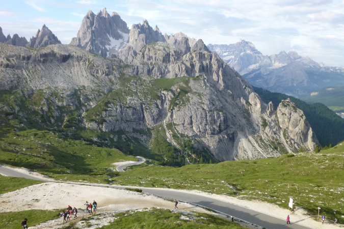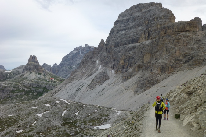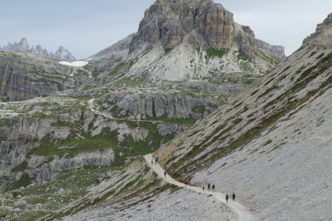 Die Morgensonne erobert zunehmend die Bergwelt und zaubert Kontraste und Farben in den Fels, sei es in die Zacken der nahen Cadini di Misurina oder in den Koloss des etwas entfernteren Monte Cristallo. Nur die Wand vor und über uns verharrt im abweisenden Schatten. Direkt am Fuße dieser Wand wird unser nächstes Zwischenziel sichtbar, zunächst nur winzig klein, dann immer mehr Kontur gewinnend. Das Rifugio Auronzo (2.320 m üNN) am südlichen Fuß der Drei Zinnen ist mehr als eine normale Durchgangsstation unserer Laufreise durch die Dolomiten. 48,5 bewältigte Kilometer und 2.800 bewältigte Höhenmeter bedeuten zwar noch nicht Halbzeit, aber ein wenig fühlt sich diese Station schon so an.