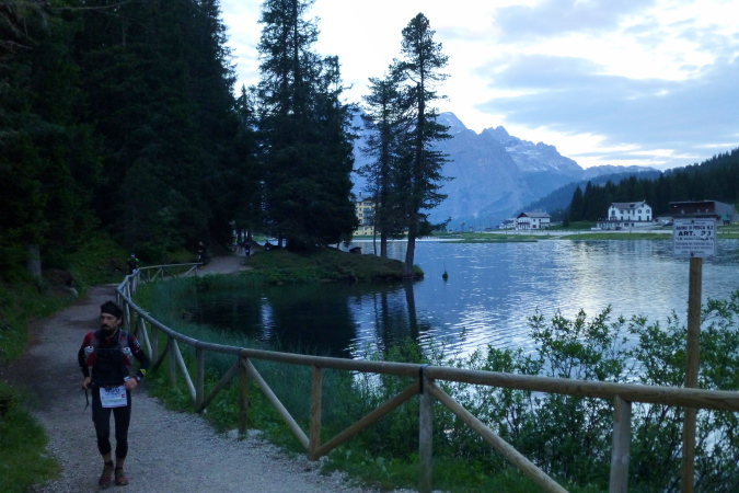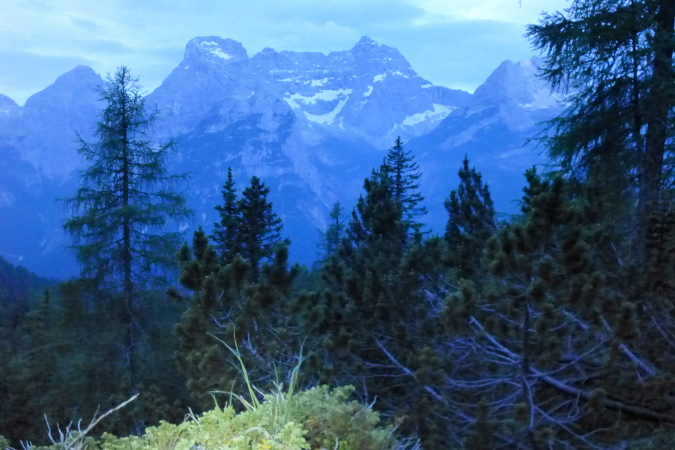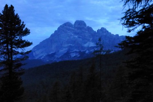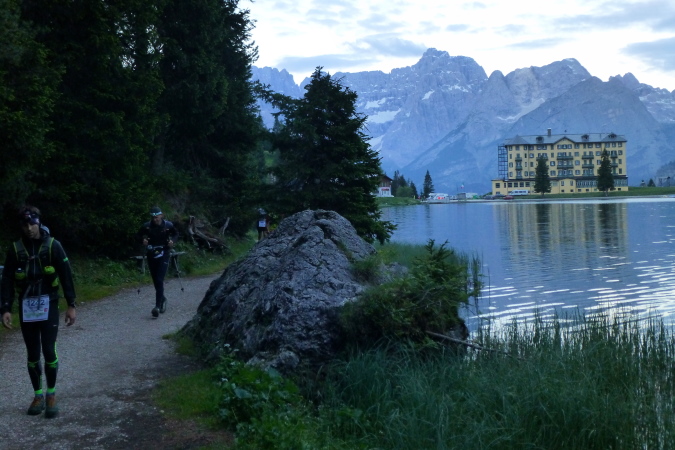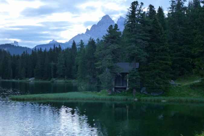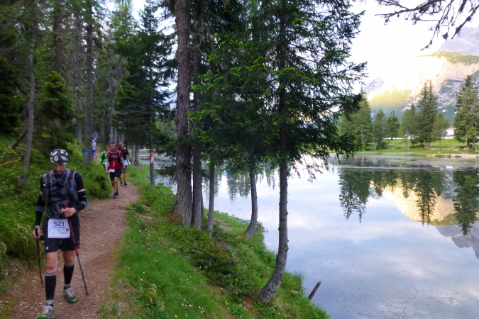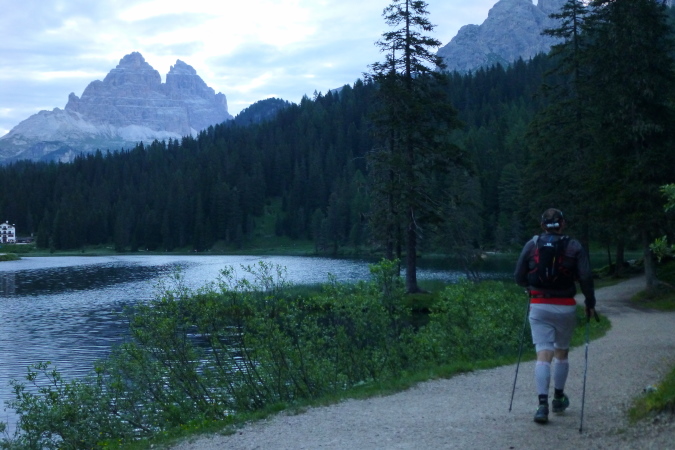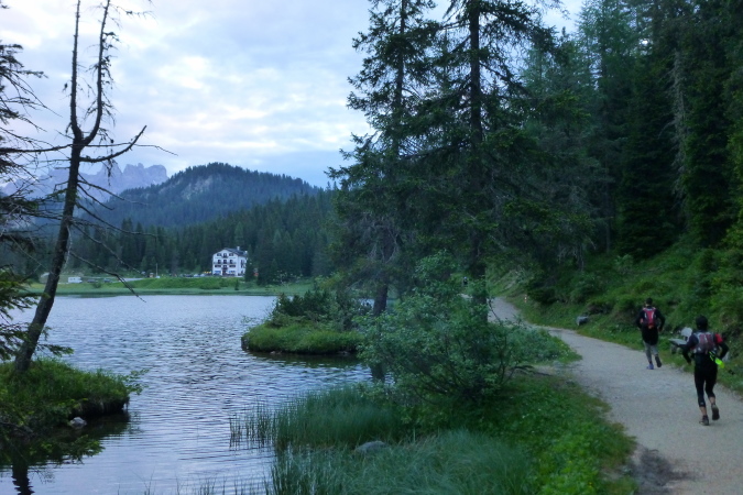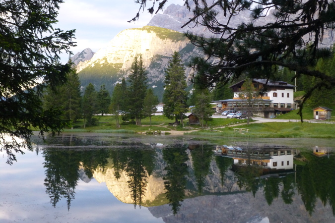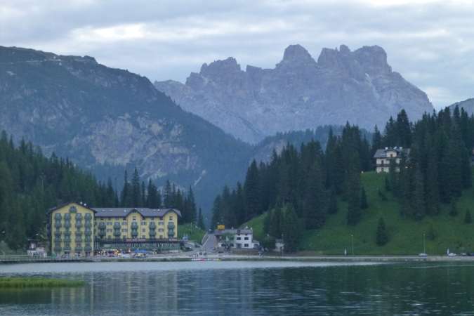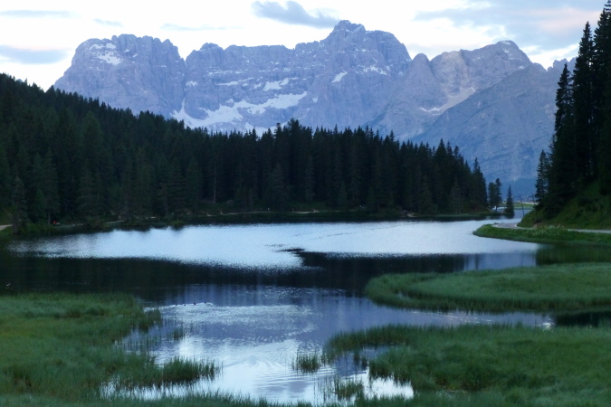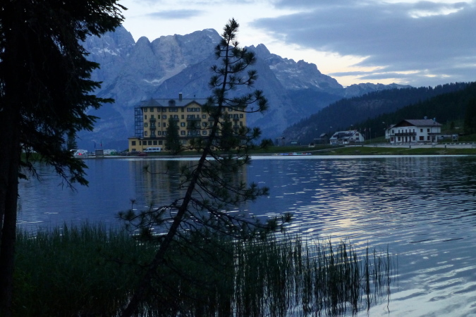 Es ist 5:30 Uhr, als ich zum ersten Mal durch den Wald unter mir die Gestade des Lago di Misurina erblicke. Nach 43 km durch die Nacht bieten sie einen ersten optischen Höhepunkt des noch jungen Morgens. Traumhaft ist die Lage des Sees auf 1.756 m üNN inmitten der 3.000er der bizarren Dolomitenriesen. Kein Wunder, dass er auch touristisch hoch im Kurs steht. Doch um diese Zeit haben wir den See noch ganz für uns, können das im weichen Morgenlicht erwachende Idyll ganz für uns genießen. Ein romantischer Weg schlängelt sich am Ostufer entlang, vorbei an kleinen Inselchen und lauschigen Buchten. Einsam thronen einige altehrwürdige Hotels am Seeufer, wie Spielzeughäuser vor dem Hintergrund der mächtigen Felsmassen wirkend.