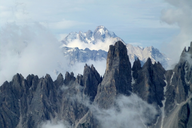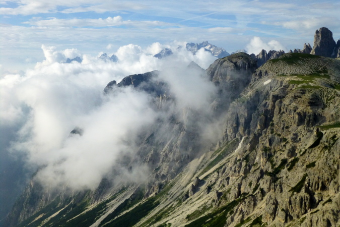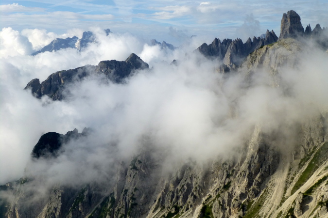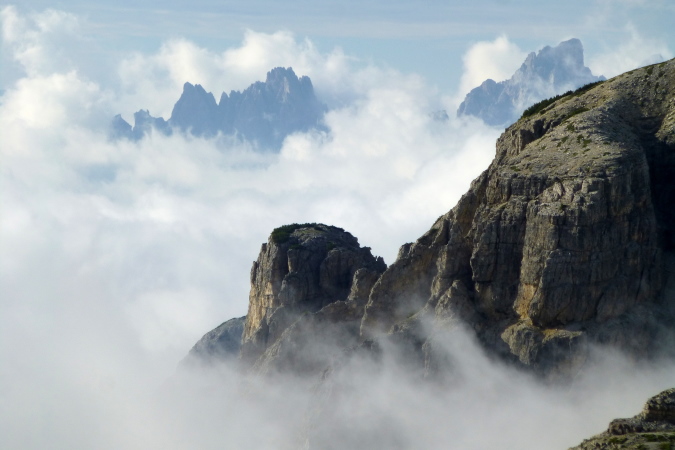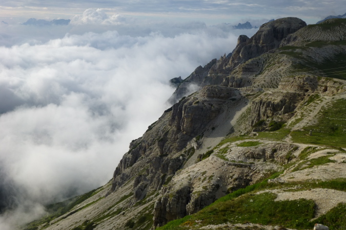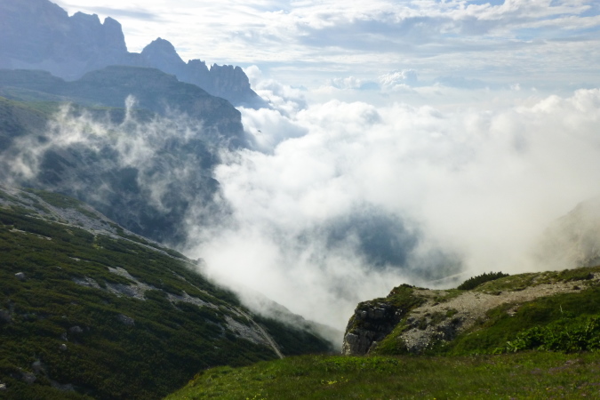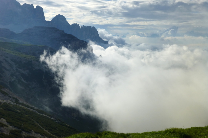 Ein staubiger, aber gut ausgebauter und breiter Weg führt, weiter auf über 2.400 m üNN ansteigend, in einem Halbkreis um die Tre Cime di Lavaredo. Doch sind es erst einmal nicht diese, die mich gefangen nehmen, sondern der Blick in die andere Richtung. Und der ist wahrlich atemberaubend. Dichte Wolken wabern unter mir im Tal und lassen daraus die sonnenbestrahlten bizarren Felsentürme wie Inseln aus einem Meer ragen. Diese Szenerie ist keineswegs statisch, sondern wechselt permanent. Immer neue fantastische Naturbilder zaubern die Wolken und ich kann nicht anders als immer wieder innezuhalten und dies mit der Kamera zu bannen. Nur langsam komme ich voran.