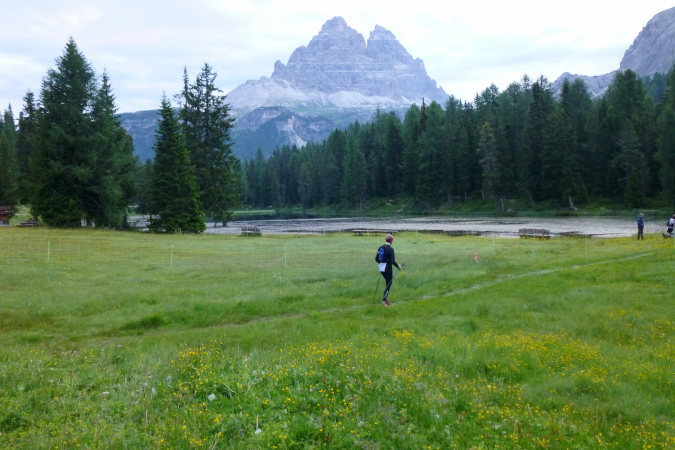 Vom verschilften Nordufer aus steigen wir auf Pfaden unweit der Tre Cime-Panoramastraße quasi eine Stufe höher hinauf zum kleinen, aber nicht minder romantischen Lago d´Antorno. Erste Sonnenstrahlen lassen die Bergwipfel und das sich im stillen Wasser spiegelnde Ebenbild erstrahlen. Mächtig und verheißungsvoll türmt sich vor uns am Horizont das wohl größte Sehnsuchtsziel unserer Laufreise auf: die Drei Zinnen. Deren berühmte, markante Silhouette lässt sich aus unserer Perspektive allerdings noch nicht erahnen. Wir blicken, quasi von der Rückseite aus, nur auf eine uneinnehmbar wirkende Felswand.