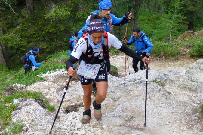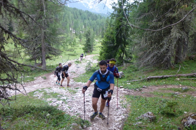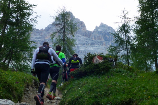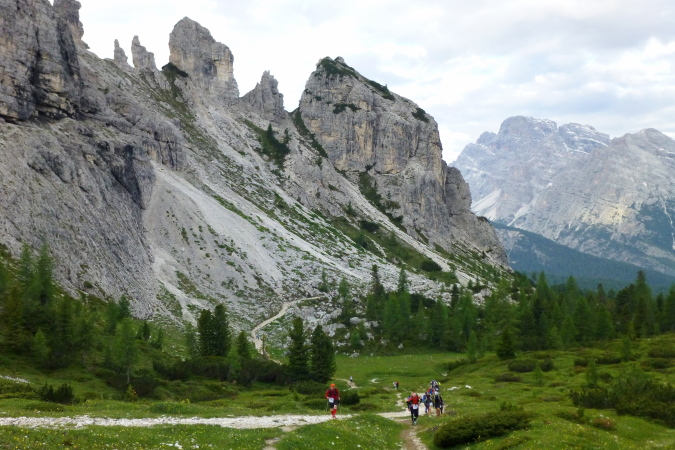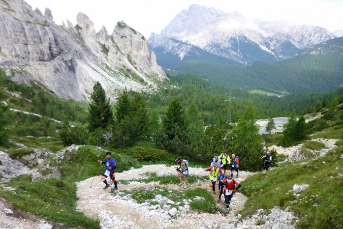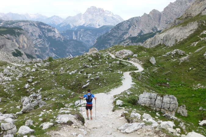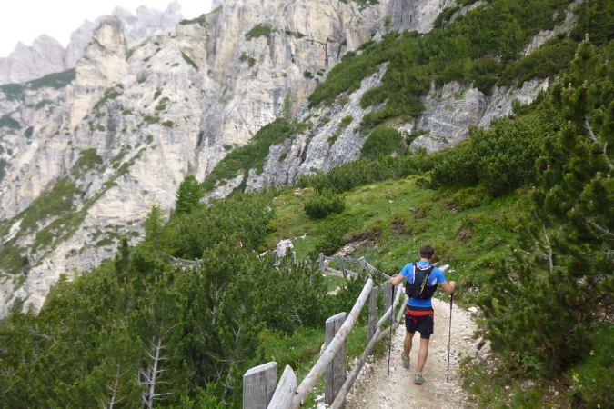 Wohin ich schaue, klicken Kameras und Handys. Je weiter ich in die Tiefe komme, desto mehr verstärkt sich der Eindruck der Majestätik, mit der diese Türme die kargen Schutthänge zu ihren Füßen überragen. Ich bin begeistert. Und beseelt, diesen Abschnitt des Trails bei diesen wundervollen Bedingungen erlebt zu haben. Aber alsbald heißt es Abschied zu nehmen von diesem einzigartigen Ort. Denn in steilen Serpentinen auf gerölligem Untergrund stürzt der Pfad hinab gen Valle della Rienza und erfordert volle Aufmerksamkeit. 1.000 Meter geht es am Stück hinab und einmal mehr ist das ein echter Härtetest für die Oberschenkelmuskulatur. Ich frage mich, wie es nicht wenige schaffen, diese Passage im Hochtempo herunter zu brechen.