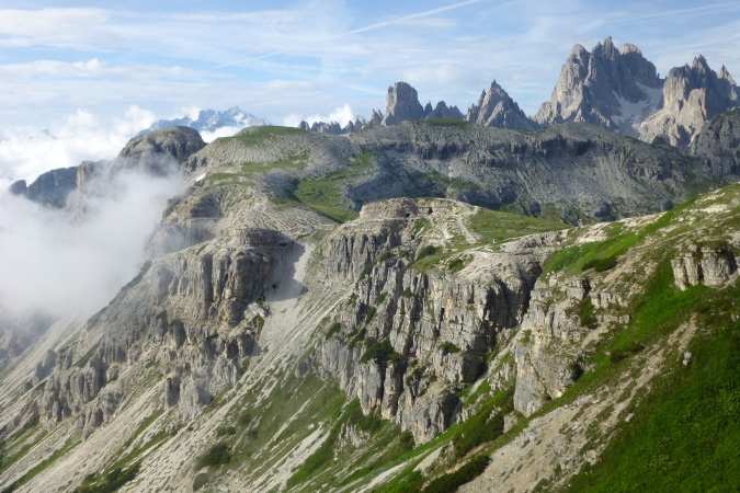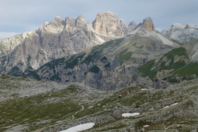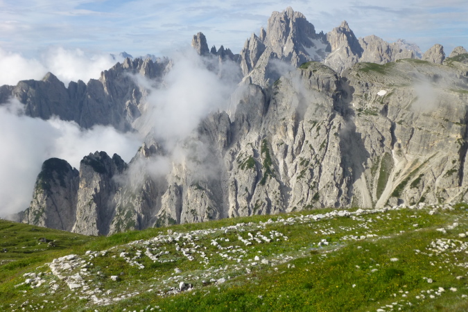 Zwar ohne Wolken im Tal, dafür mit mehr Wolken über den Bergen, aber nicht minder spektakulär präsentiert sich die Bergwelt jenseits des Passes. Bis weit in die Ferne kann ich unseren Pfad sich durch die Einsamkeit des Hochgebirges schlängelnd und dann gen Rienza-Tal verlierend verfolgen. Die Bergwelt am Horizont ist einmal mehr in ihrem Formenreichtum einfach nur „dolomitisch“.