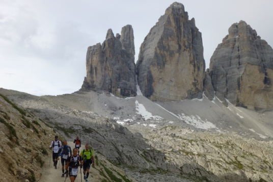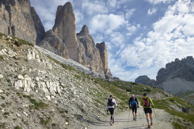 Vorbei an der Lavaredo-Schutzhütte und rund um die Cima Piccola macht unser Weg einen weiten Schwenk. Aus dieser Perspektive nun endlich erleben wir die Drei Zinnen seitlich versetzt genauso, wie es das Logo des LUT abbildet. Direkt auf die Cima Piccola halten wir zu und erreichen unmittelbar an ihrem Fuße die Passhöhe.