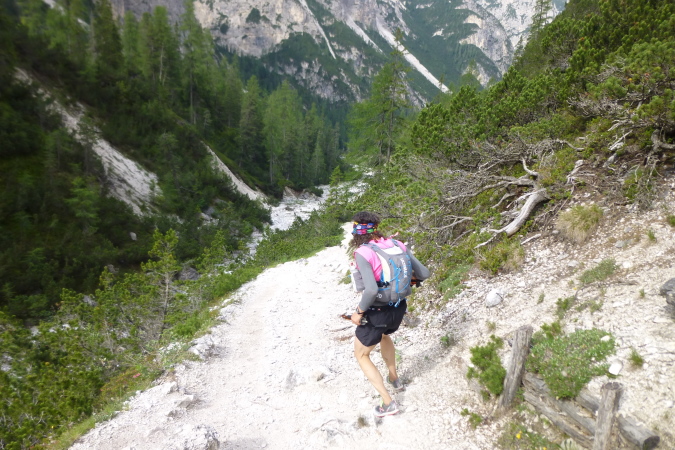 Die Natur kehrt zurück. Niedrige Latschenkiefern besetzen dicht an dich die Hänge. Tief im Tal rauscht die Rienz in einem fast blütenweißes Gesteinsbett durch das enge Tal. Hier ist die Welt noch in Ordnung, denkt man unwillkürlich. Über Kilometer folgen wir auf einem breiten Naturweg dem Wildbach. Und seit langem kann auch ich wieder einmal ein längeres Stück halbwegs entspannt laufen.