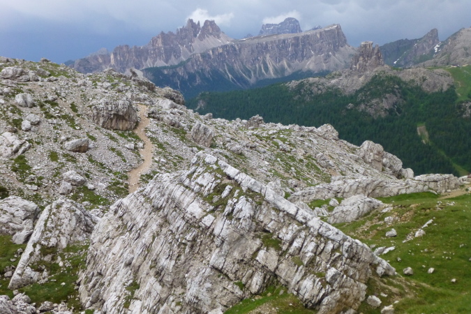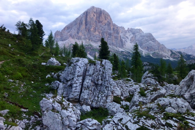 Ein wenig drängt es mich dann doch, will ich noch möglichst viel bei Tageslicht erleben. Den Rucksack umgeschnallt stelle ich mich gedanklich darauf ein, dass die nächsten 400 Höhenmeter kein Pappensteil sein werden. Der Streckenplan spricht eine deutliche Sprache. Noch recht harmlos beginnt die Etappe über einen holprig-morastigen Waldweg. Aber schon bald schiebe ich mich mit hartem Stockeinsatz Schritt für Schritt in kurzen Kurven steile Felsstufen empor. Der zunächst noch dichte Wald lichtet sich immer mehr. Ich bin wider Erwarten gut drauf. Gleichmäßig schnell und ohne Japsen schaffe ich es voranzuschreiten. Erst neben, dann hinter und schließlich gar unter mir blicke ich auf die Cinque Torre, während sich direkt vor mir der Averau 2.649 m hoch in den Himmel schiebt. Der Weg mündet in ein breites Schotterfeld, unschwer als Skipiste erkennbar. Kurz nach 21 Uhr ist es, als ich mit dem exponiert liegenden Rifugio Averau (2.413 m üNN) den gleichnamigen Pass erreiche.
