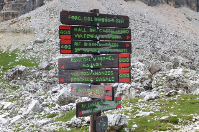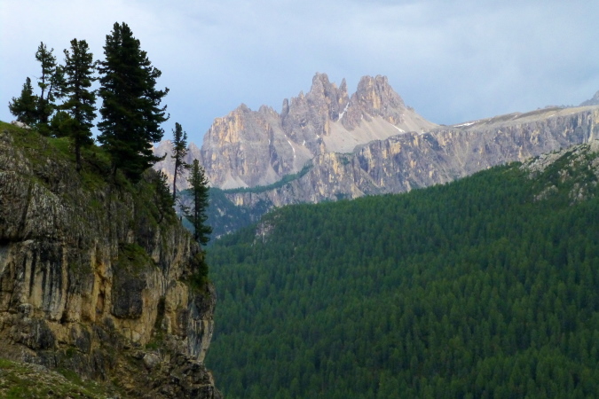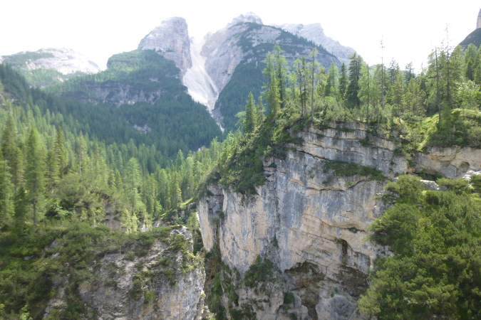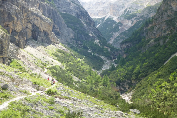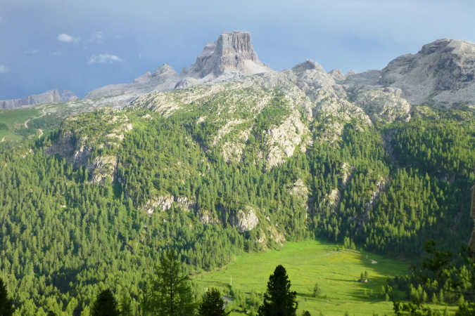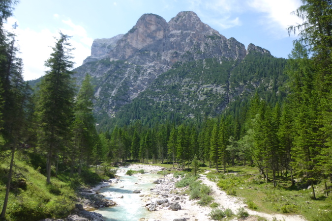 Langsam lichtet sich die Bewaldung, die Berge zu beiden Seiten des Tales rücken näher: Rechts die Cime die Furcia Rossa, zur Linken der mächtige Gebirgsstock der Tofane. Das Dreigestirn der Tofane – nun habe ich es tatsächlich und auch noch gut bei Tag bis hierher geschaft. Nur wenige Kilometer Luftlinie trennen mich hier von Cortina. Doch dazwischen türmt sich der brachiale Riegel der Tofane bis auf über 3.200 Meter.