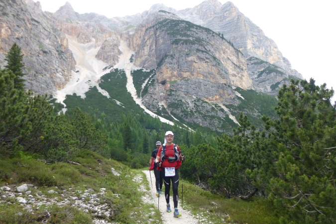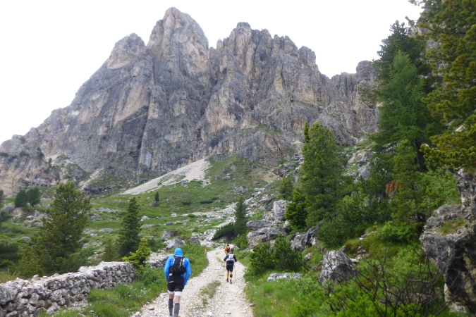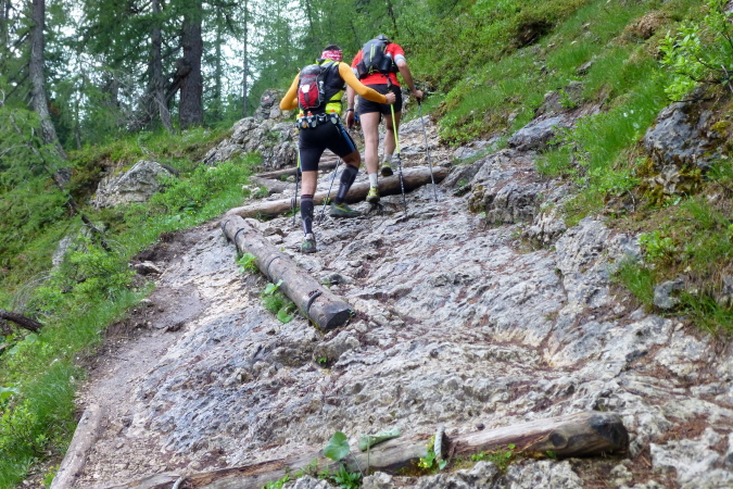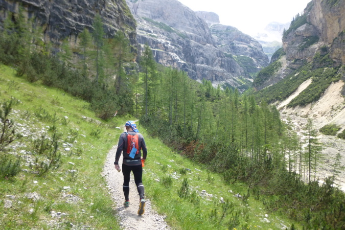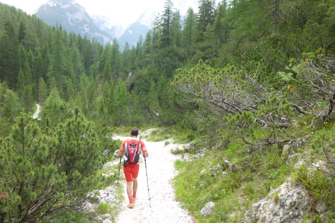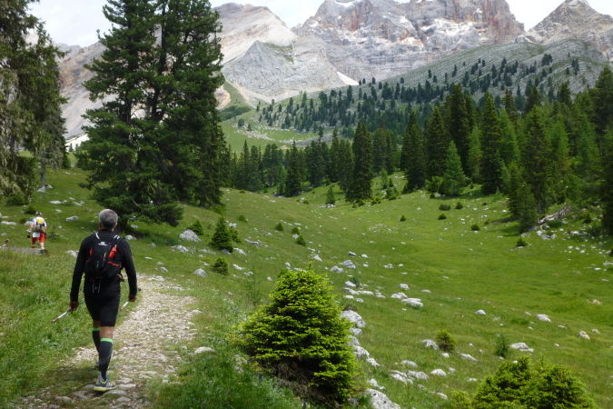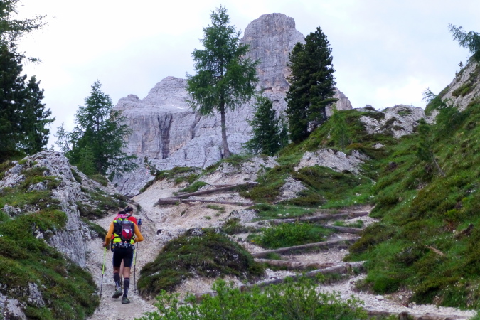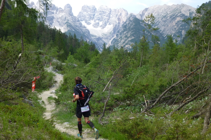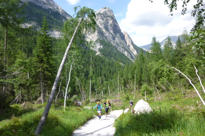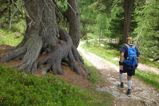 Wenig spannend geht es los. Durch dichten Nadelwald führt eine Forststraße beständig nach oben. Viel zu sehen gibt es nicht und auch das Läuferfeld hat sich sehr verflüchtigt. Nur und erst an den Verpflegungsstellen bekommt man eine Ahnung davon, dass durchaus eine Menge Leute unterwegs sind. Die Monotonie ändert sich jedoch zusehends in der Höhe. Eine romantische hochalpine Almlandschaft ist der Lohn der Mühen. Unser Pfad windet sich vorbei an wild wurzelnden Bäumen. Zur Rechten türmt sich die Croda Rossa bis in eine Höhe von 3.146 m. Die