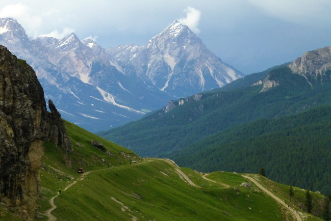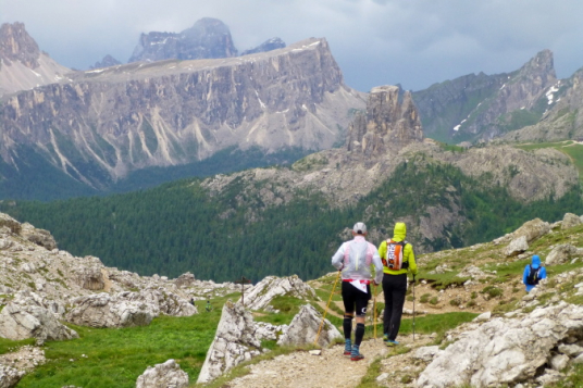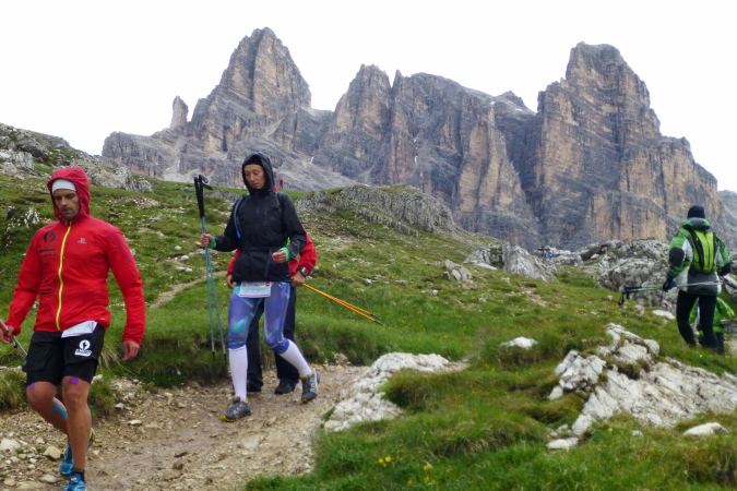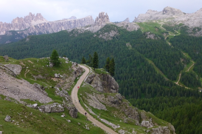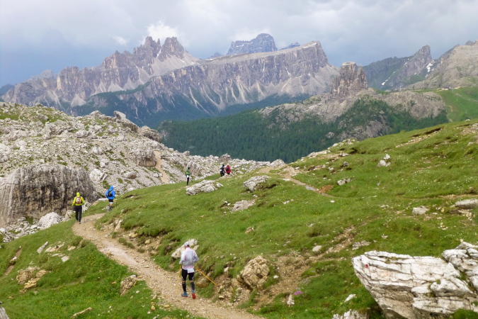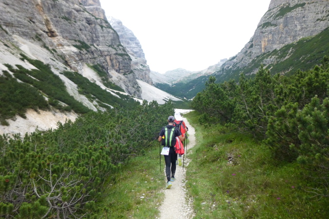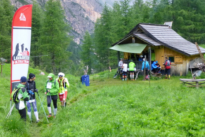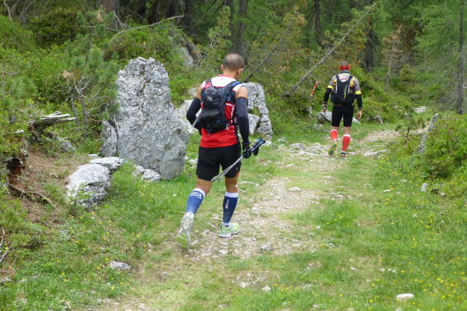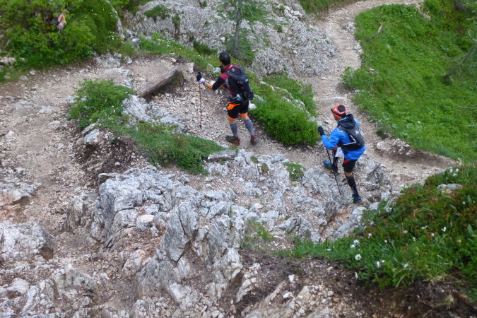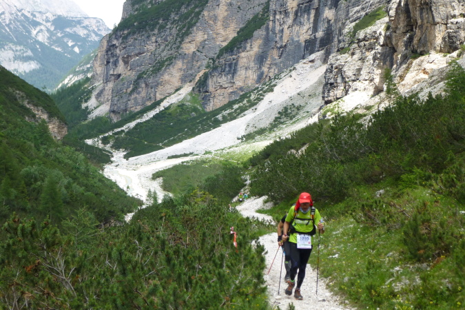 Wenig spannend geht es los. Durch dichten Nadelwald führt eine Forststraße beständig nach oben. Viel zu sehen gibt es nicht und auch das Läuferfeld hat sich sehr verflüchtigt. Nur und erst an den Verpflegungsstellen bekommt man eine Ahnung davon, dass durchaus eine Menge Leute unterwegs sind. Die Monotonie ändert sich jedoch zusehends in der Höhe. Eine romantische hochalpine Almlandschaft ist der Lohn der Mühen. Unser Pfad windet sich vorbei an wild wurzelnden Bäumen. Zur Rechten türmt sich die Croda Rossa bis in eine Höhe von 3.146 m. Die
