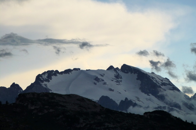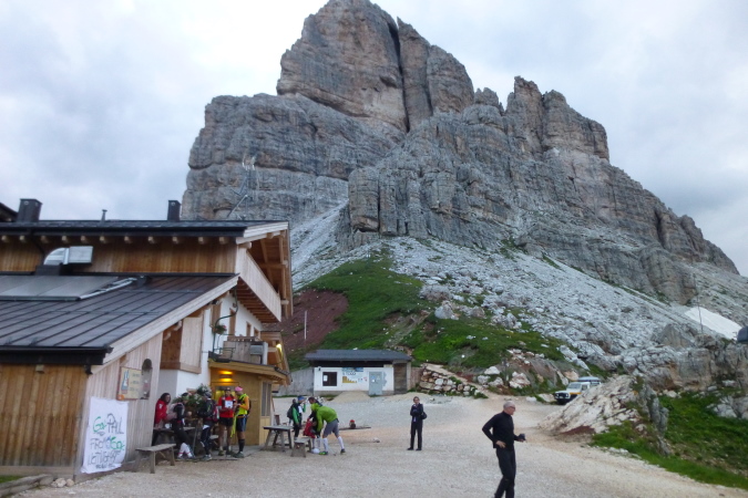 Dennoch froh bin ich auch, tief unten im Tal eine Hütte zu entdecken, die nur eines bedeuten konnte: Dort ist - endlich - unsere nächste Zwischenstation. Es ist 19:30, als ich nach 95 km und 4.950 Höhenmetern das Rifugio Col Galina (2.064 m üNN) unweit des bekannten Falzarego-Pass erreiche. Ich genieße in der Abendsonne die reichhaltige Verpflegung im Wissen: Bei der nächsten Station wird alles anders sein. Vor allem finster.