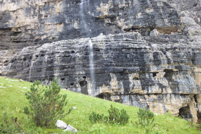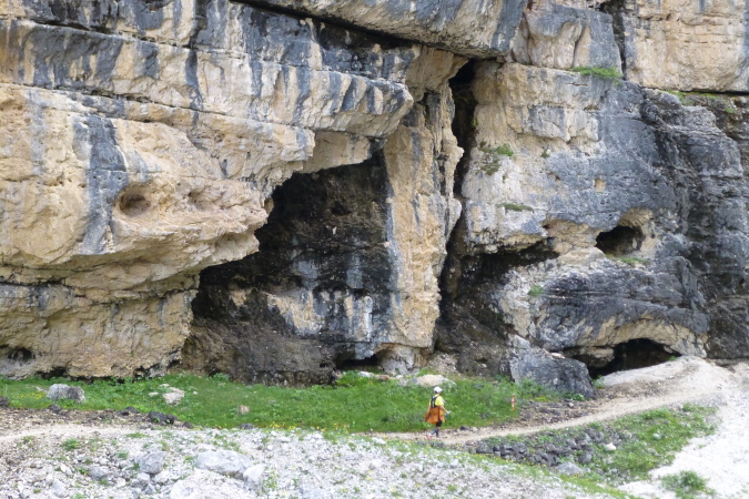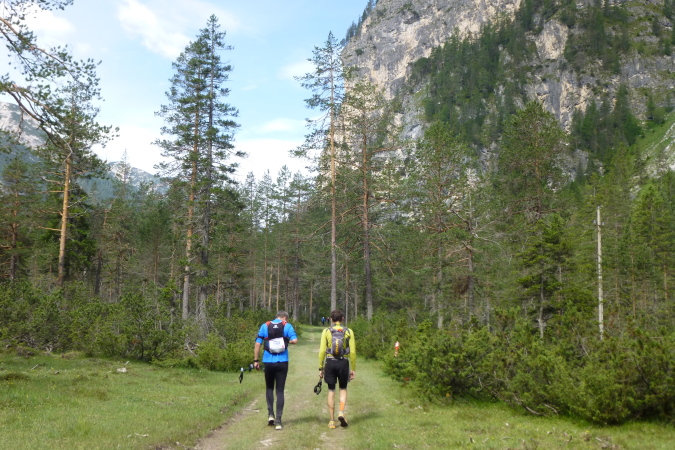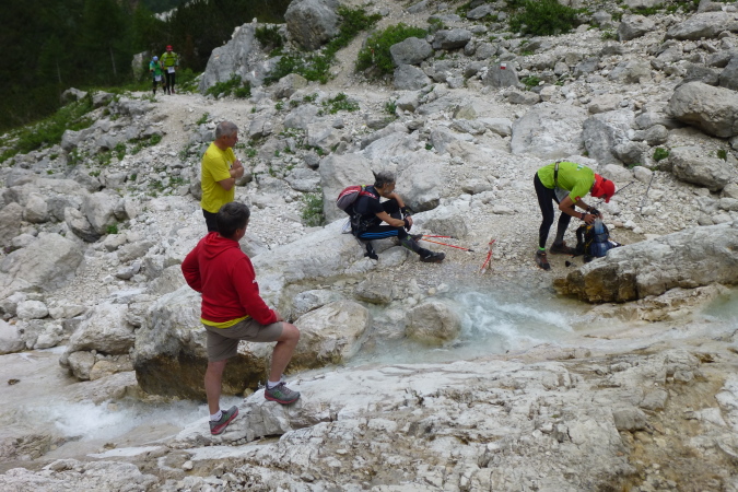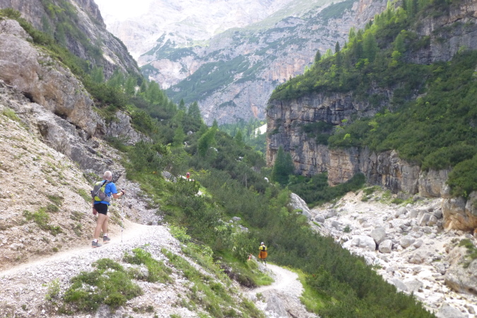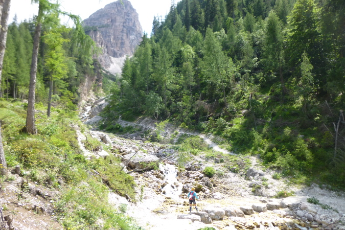 Die Travenanzes verlässt ihre Klamm und rauscht nun als „normaler“ Wildbach durch den Talgrund. Weit reicht der Blick hinein in das langgestreckte Tal. Unberührt, wild, wundervoll ist der Eindruck. Bis weit am Horzont kann ich den Verlauf des Bergpfades beobachten und einmal mehr die einsam darauf tanzenden Läuferpunkte. Die Sonne lässt immer wieder den Fels erstrahlen, aber drückt längst nicht mehr so sehr. Ohne Zweifel: Auch dieser Streckenabschnitt ist ein wahres Highlight des Kurses. Immer mehr verengt sich das Tal, höher und höher kommen wir hinauf. Kleine Wasserfälle überspülen eine finstere, höhlenübersähte Wand der Tofane.