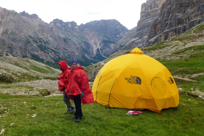 Dass das Wetter in den Bergen so rasant wechselt, kann ein Problem sein. Oder auch das Gegenteil. Denn auf einmal klart es wieder auf, ja selbst blaue Streifen dringen durch die Wolken. Und sogleich breitet sich die Hochgebirgskulisse wieder in ihrer ganzen grandiosen Schönheit aus. Immer felsiger und karger wird der Untergrund. Über mir erspähe ich ein leuchtend gelbes Kuppelzelt. Da weiß ich: Es ist geschafft. Zumindest für den Moment. Wie an jedem Pass harren Bergretter der Ankömmlinge und trotzen jedem Wetter. Auf 2.331 m üNN auf dem Pass Forcella Col de Bos stehend genieße ich in tiefen Zügen die wundervolle Aussicht auf die magischen Bergzacken dies-wie jenseits des Passes. Ja, es hat sich wahrlich gelohnt durchzuhalten.