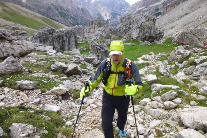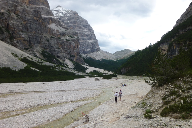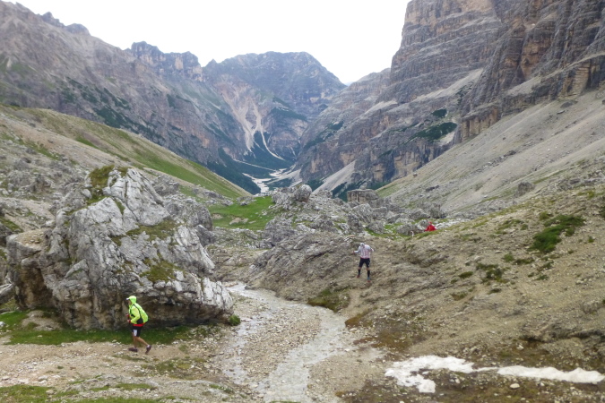 Es ist gegen 16 Uhr, als ich die fast zu einem Rinnzahl verkümmerte Travenanzes quere und in ein weites Hochtal trete. Ein herrlicher Weg führt zunächst durch niedrigen Latschenkiefernbestand. Doch damit ist ganz plötzlich Schluss. Und vor uns liegt eine fast blendend weiße Steinwüste, durch die erneut ein Gebirgsbach mäandert. Kleine Fähnchen markieren den Weg, denn ein solcher ist kaum erkennbar. Bei Mittagssonne mag dieser Weg eine Tortur sein. Doch düstere Wolken am Himmel bringen Kühle, verheißen aber sonst wenig Gutes. Schier endlos zieht sich der weiße Steinestrom hin. Zur Herausforderung wird, als ich den nicht gar so schmalen Gebirgsbach queren muss. Eine Furt gibt es nicht und auch sonst ist eine ideale Stelle zum Queren nicht erkennbar. So mancher rennt entschlossen einfach durch das Wasser. Andere versuchen es über größere Steine, landen aber auch dabei im Nass. Ich wage schließlich den Megasprung und komme – lange Beine sei Dank – tatsächlich trockenen Fußes hinüber.