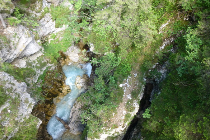 Das Travenanzes Tal bestimmt über viele Kilometer unseren Weg nach oben. Kräftig ansteigend, aber vergleichsweise gemütlich und auf breitem Naturweg geht es durch das zunächst noch breite, bewaldete Tal. Nur aus diffuser Ferne dringt das Rauschen des Gebirgsbachs an meine Ohren. Umso überraschter bin ich, als ich an der Ponte Outro unvermittelt in eine unglaublich schmale wie tiefe, wild zerklüftete Klamm blicke, durch deren Grund das Wasser tobt. Sind es 80 oder 100 Meter oder gar mehr? Schwer zu schätzen ist dieser Abgrund, aber ungemein beeindruckend ist die Szenerie. Nur wenig später gibt die Klamm über der Ponte dei Cadoris einen weiteres Mal eine spektakuläre Vorstellung.