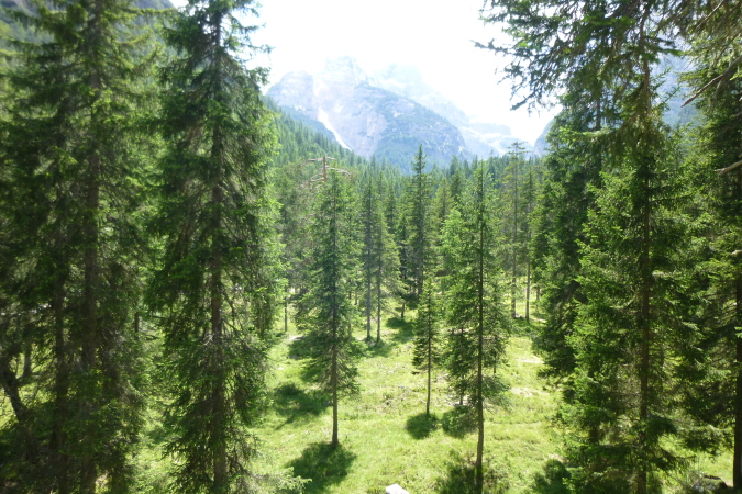 Als Läufer folgen wir dem Ostufer und treten hinter dem See ein in einen luftigen Nadelwald im Talboden. Ein schöner entspannender Naturpfad führt hindurch, der jedoch alsbald in eine neu angelegte breite Schotterstraße mündet. Die auf dieser Straße folgenden Kilometer bis Cimabanche sind die Einzigen, die ich im Nachhinein als ernüchternd bezeichnen würde. Denn auf diesen langsam ansteigenden Kilometern bin ich schutzlos der mittlerweile heiß vom Himmel brennenden Sonne ausgeliefert. Ich habe mir ja Sonne gewünscht – aber doch nicht so!