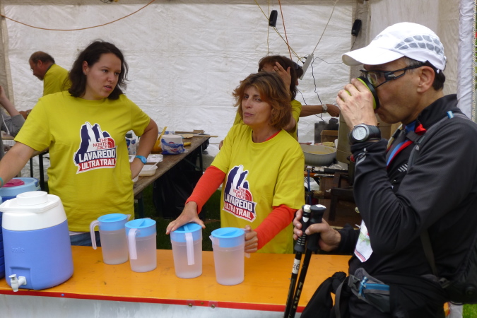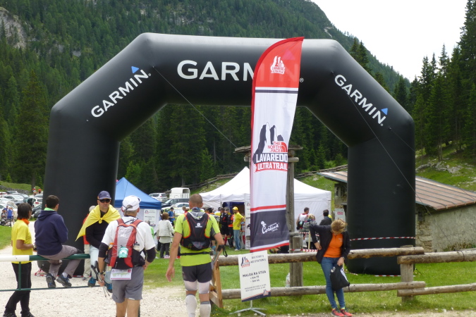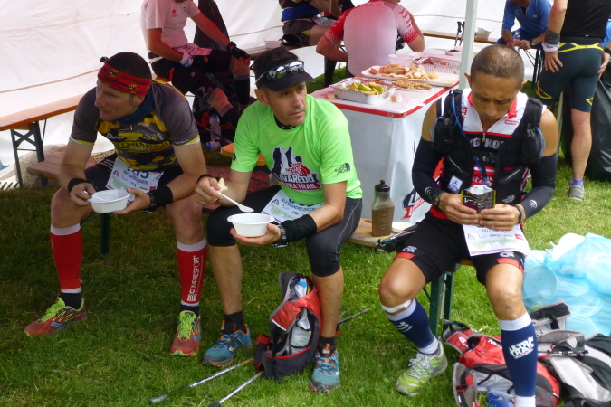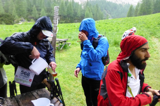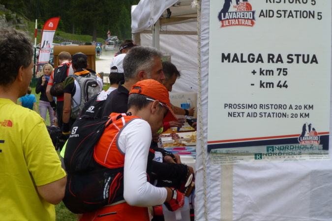 Das Berghaus Malga Ra Stua nach 75,4 km ist so etwas wie eine Schlüsselstelle des Laufs. 3.700 Höhenmeter sind bis hier her bewältigt und man muss sich entscheiden: Tue ich mir den großen herausfordernden „Brocken“, der nun folgt, noch an oder reicht es einfach? Nicht wenige sehen Zweiteres und füllen einen schon bereit stehenden Bus. Ich gebe zu: Malga Ra Stua als „Exit“ zu wählen habe auch ich mir schon lange vorher überlegt. Aber in diesem Moment ist das keine Frage mehr. Wenn nicht jetzt, wann dann … ich bleibe dabei, getreu dem Motto: Einfach mal schauen, wie weit ich komme. Und eile dem Buffet entgegen. Ausgesprochen chillig geht es hier zu. Voll ist die Wiese mit Läufern und Familienangehörigen, die hier ein Wiedersehen feiern. Im Hintergrund ertönt lässige Musik. Auch ich lasse mir Zeit, greife zu Deftigem wie Nudelsuppe, Salami und Käse: Und schlürfe ein kühles Bierchen. Herrlich.