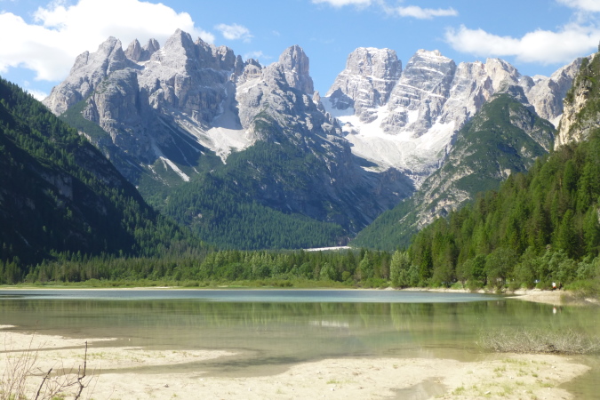 Der Dürrensee bzw. Lago di Landro (1.406 m üNN) ist ein weiterer Ort, der alle Klischees der Dolomitenromantik erfüllt. Türkisfarben schimmert das Wasser, sandig verlandet sind die Ufer, saftig grün umringen ihn Wälder und mächtig türmt sich gen Norden das Cristallo-Massiv über dem See. Und: Hier ist für uns nun nach 60 km echte Halbzeit.