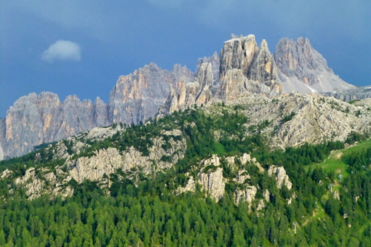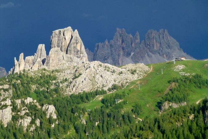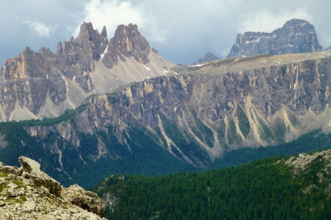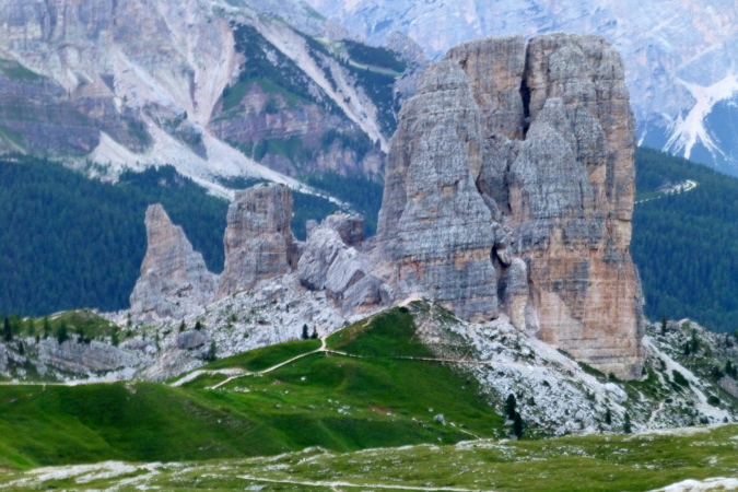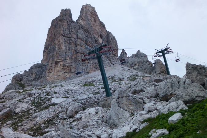 Eine sonnenbestrahlte Gruppe besonders spitzer Felsnadeln gar nicht so weit weg fällt mir besonders ins Auge. Es sind die berühmten, bis auf 2.361 m üNN aufragenden Cinque Torri, ein weiterer Touristenmagnet der Region. Die Erosion hat aus einem einst einzigen Felsblock dieses fast schon filigran wirkende Felsenkunstwerk gemeißelt. Nach seinen fünf Haupttürmen ist die gesamte Formation benannt. Und wie von einem gigantischen Balkon aus genießen wir aus luftiger Höhe einen überwältigen Blick darauf.