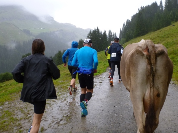 Nach dem Überqueren eines Baches ändert sich der Untergrund, denn es laufen nun Rindviecher herum und die geben dem Weg eine spezielle Note. Also aufpassen. Einige Viecher lassen sich von der Lauferei anstecken und trotten mit uns mit. Wenn das mal keine dicke Milch gibt!
