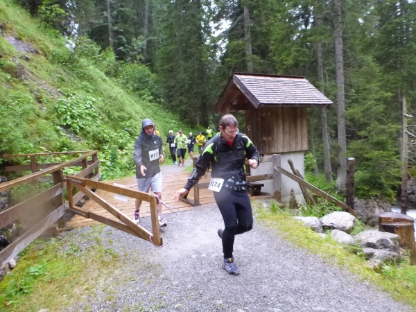 Um Punkt 10.00 Uhr werden beide Läufe bei Nieselregen gestartet. Und dann heißt es „AGASA“, los geht’s auf die Runde um das Karhorn. Die Holzbrücke über den Lech und der anschließend ansteigende Schotterweg bringt gleich Ruhe in das Feld. Denn wer hier einen Schnellstart hinlegt, der wird später über die Steigungen fluchen, wenn die Beine blau werden. So rund 100 Höhenmeter warten auf der ersten Steigung, bis wir in den Wald hineinlaufen. Der Weg ist befestigt und hat kaum Wasserlachen.