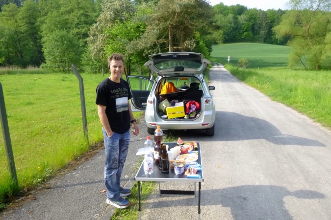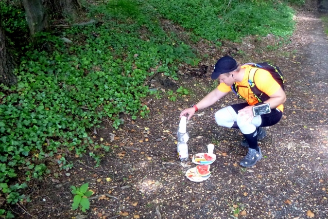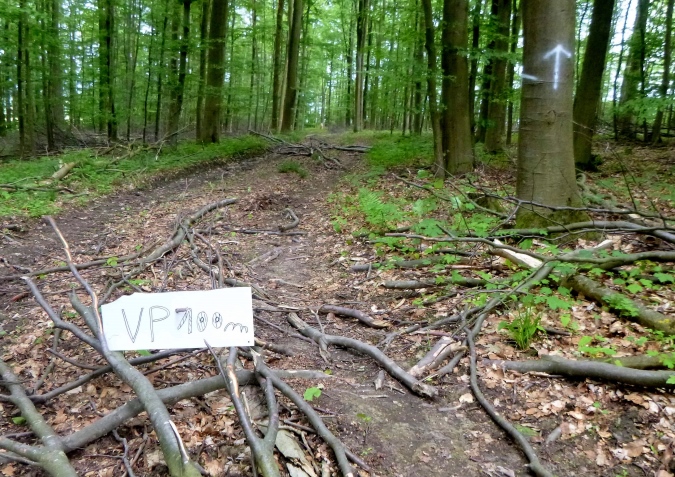 Nun aber hoch, der Berg ruft. Breite Straße, Schotter, dann Waldweg. Übrigens: keine weißen Pfeile mehr und die Karte hilft auch nur bedingt. Ohne GPS geht auf der zweiten Hälfte nix. Oder es geht schief und man bekommt Extra-Kilometer. Der Abzweig vom schönen Weg ist perfekt getarnt. Totholz, Kraut und ein Steilhang sorgen für Verdruss. Aber dahinter ein Forstweg, Testgelände der Nordic Walker. Aber die sind wohl alle bei Käsesahne anderweitig beschäftigt. Zick und Zack am Waldrand und tief hinein und dabei immer nur hoch. Körnchen sind gefragt. Aus allen Ecken und Ritzen kratze ich mir welche zusammen. Erst VP 4 bringt Erlösung. Günstig an einer wichtigen Abzweigung gelegen, gibt’s Tips und Futter und Isotonie.