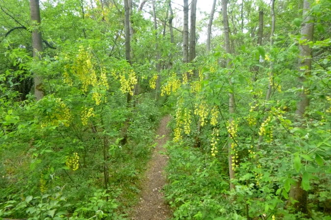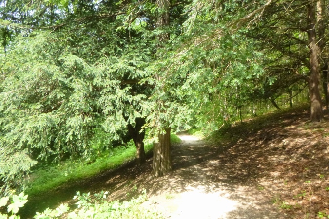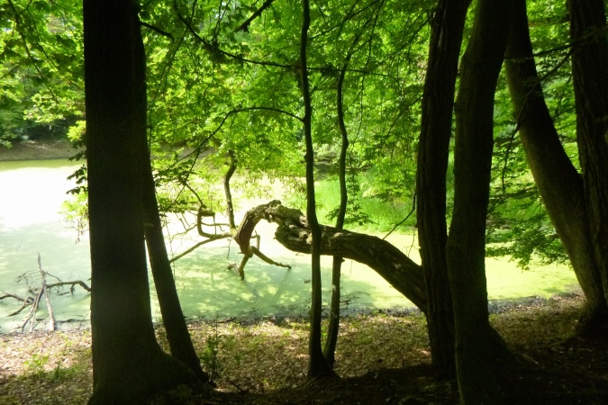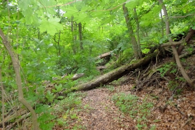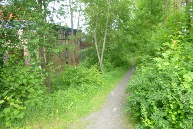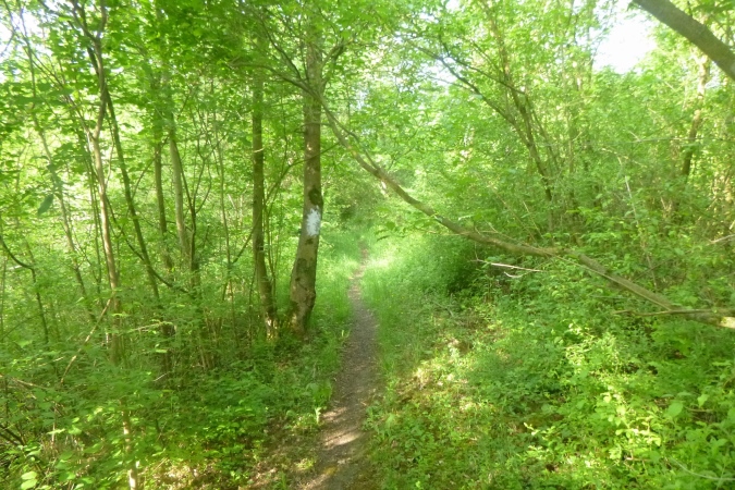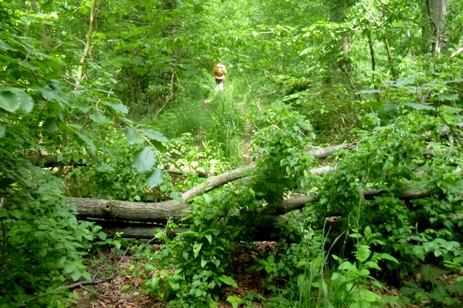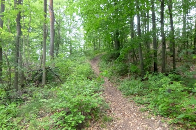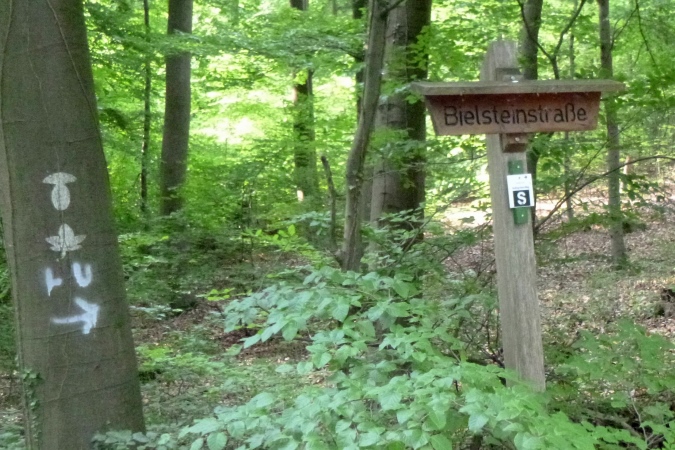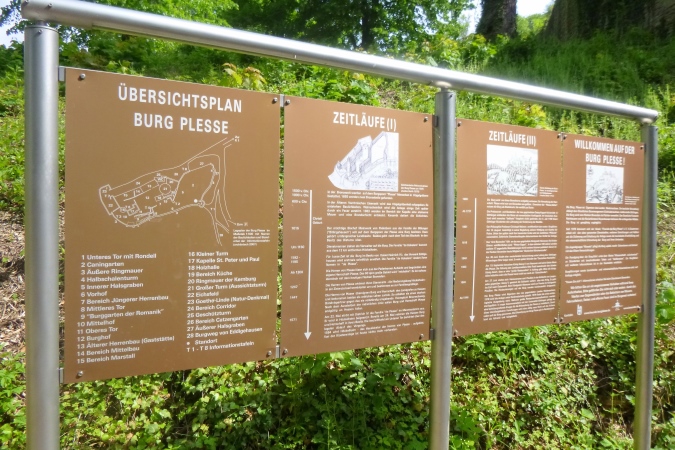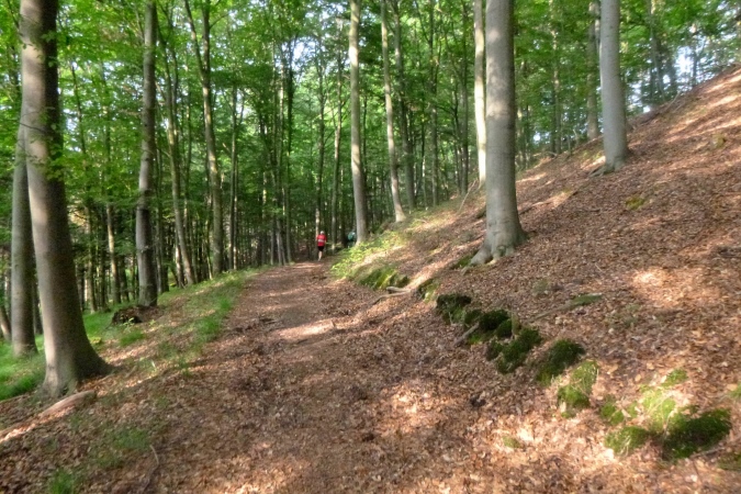 Kultur dann auch bei der nächsten Burg, die Plesse. Mit VP und grandioser Aussicht. Weit weg im Dunst die Gegend, durch die wir gleich laufen sollen. Mann, ist das weit weg. Noch eben das Isotonische ausgetrunken und dann ab. Nach runter und rauf aber erst noch ein Naturschmankerl: Ein kleiner Abstecher in den nördlichsten Eibenwald. Auf den Schildern steht auch Elbenwald, aber es sind diese uralten Nadelbäume gemeint. Erst dann dürfen wir runter ins Tal brettern nach Bovenden. Unter dem Ort, im Tunnel versenkt, die wichtigen Nord-Süd- Bahnlinien, dann die A7. Was für ein Krach. Was bin ich froh, als ein wüster Trail in den Wald hinein führt. Zugewachsen mit Brennnesseln, Hindernisse aus Totholz und fiese Schlammlöcher. Also nix zu meckern.