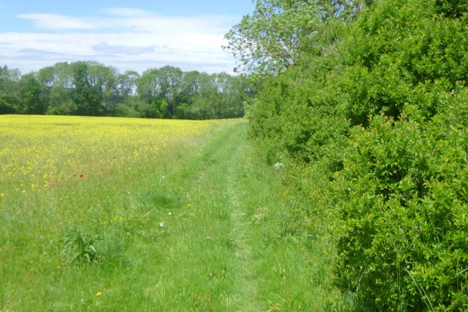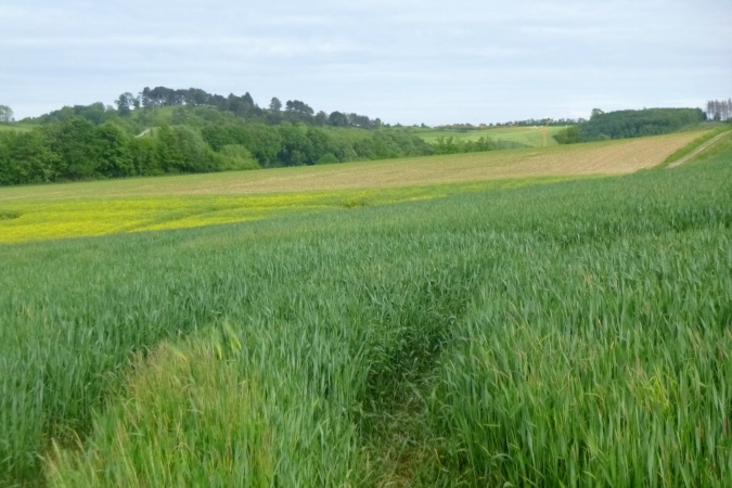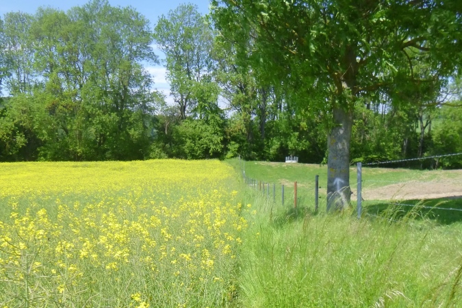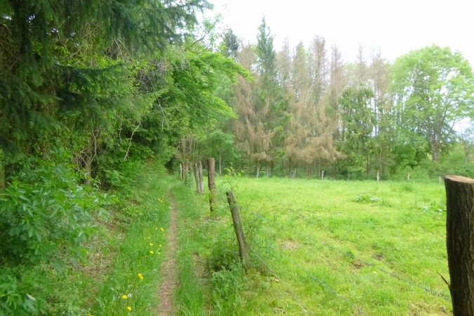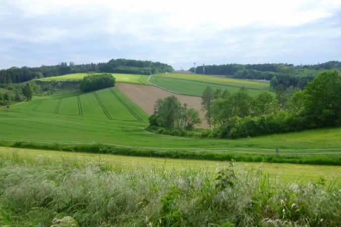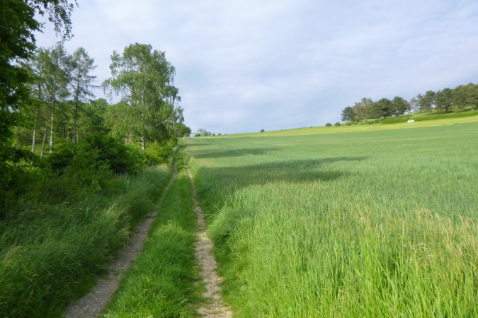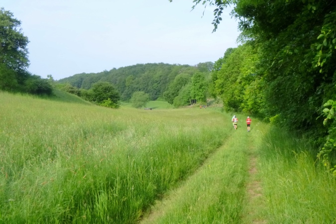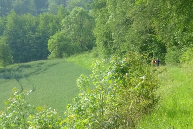 Höchste Zeit, wieder in die Berge zu traben. Diesmal sind es die westlichen. Knapp die Hälfte ist geschafft, dann kommt Stefans ganz besondere Heimtücke: Von einem breiten, schönen Weg leitet er uns an einem Feld mit brusthohem Raps längs, direkt auf einen Bach zu. Kein friedlich daher murmelnder, sondern ein tief eingeschnittener mit mit brutal steilen Flanken und altem Gerümpel und Schwemmholz drin. Da runter ist schon fies, da drüber eine Geschicklichkeitsfrage. Man sieht nix, kann sich nirgends festhalten und oben sind die Brennnesseln am Feldrand. Zwischen der Gerste und der Abbruchkante in den Orkus ist gerade mal eine Handbreit Platz, die über Sein oder Nichtsein entscheidet. Für alle, die Pech haben: VP 3 hält frische Socken bereit…