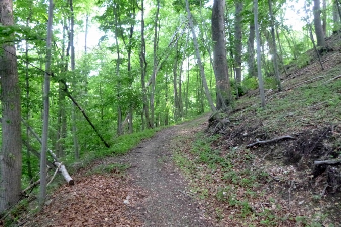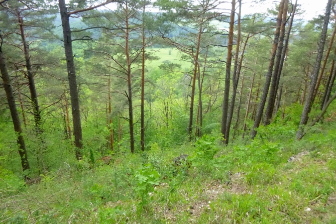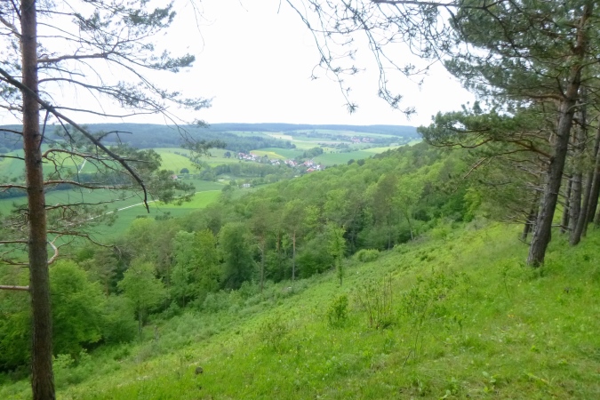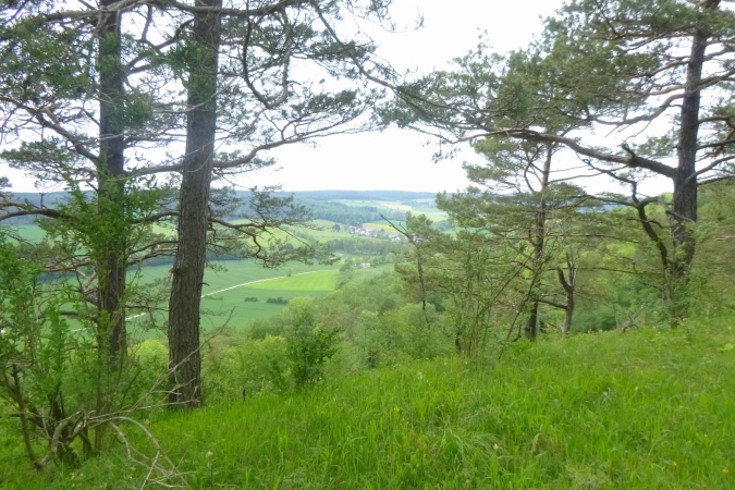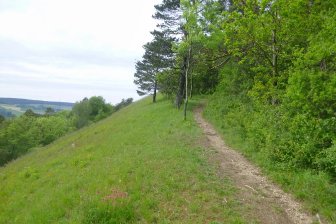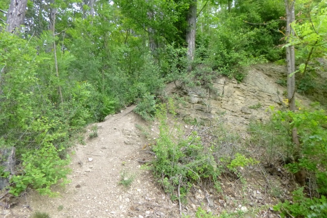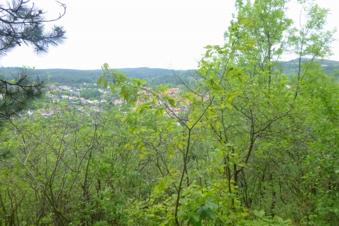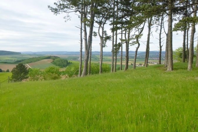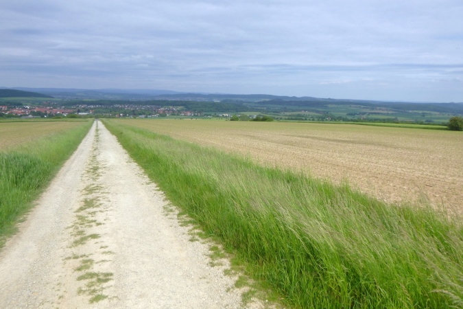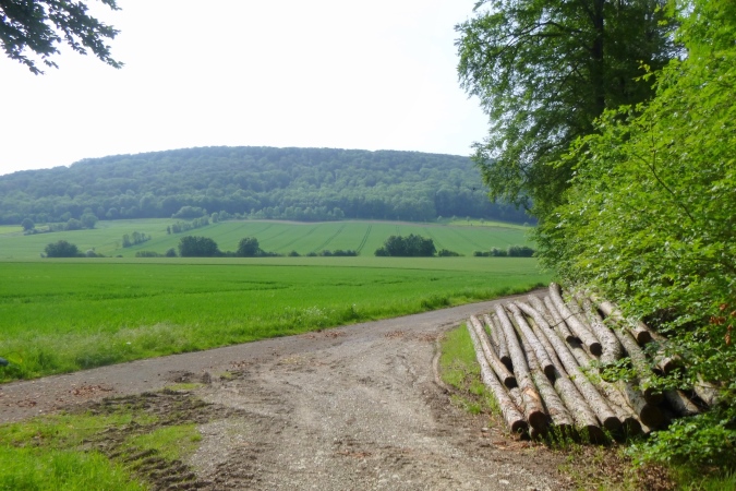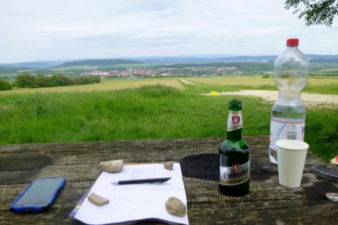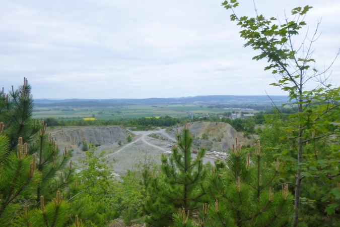 Jetzt einen Kammweg lang, Aussicht auf das berühmte Hardegsen genießen und im weiten Bogen ins Tal runter, eine riesige Unterführung durch und am Stadtrand brutal steil wieder hoch. All die schönen Höhenmeter sind vernichtet, die Bahn gequert und der brutalste Bergkamm von allen erklommen. Rechts tut sich ein Loch auf, ein alter Steinbruch war das. Das gibt einen ersten Eindruck von der Höhe. Aber der Kammweg führt noch weiter. Wenn dann doch mal eine Senke mit leichtem Bergab dazwischen kommt, ist das eher ein topographisches Versehen. Es geht nur hoch und zwar dort, wo der Weg am schmalsten ist.