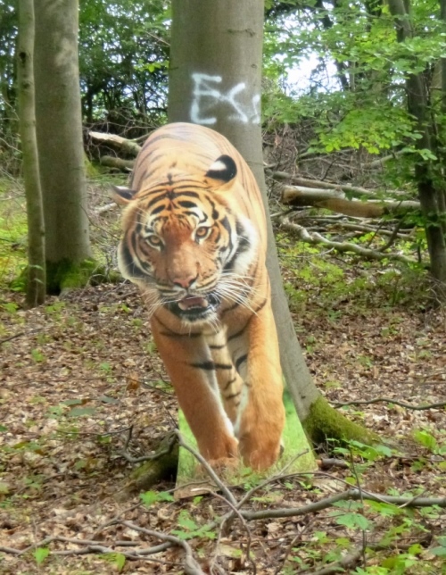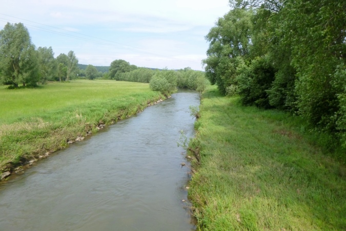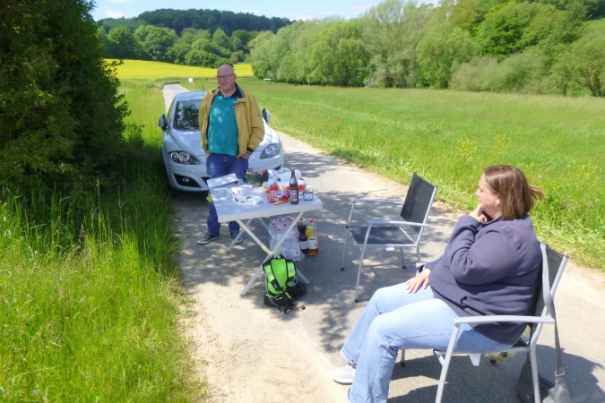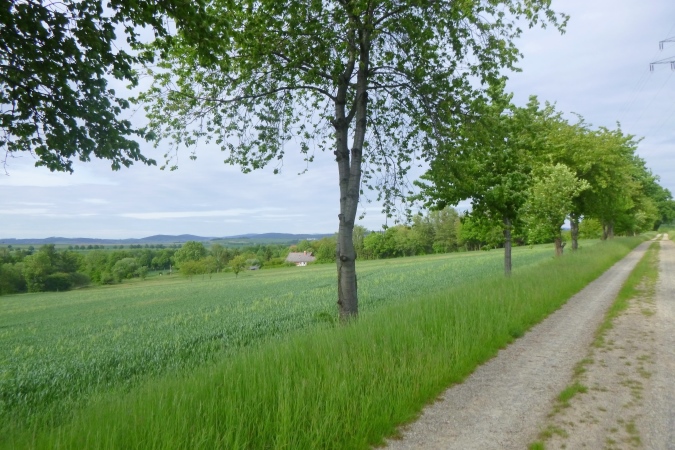 Ein wenig Zick und Zack, erste weiße Pfeile/LU sind zu sehen, als mich ein Tiger bedroht. Sieht richtig echt aus, der Bursche. Er bewacht VP 5, Stefan musste mal weg, hat aber liebevoll den Tisch gedeckt. Hier beim Isotonischen sitzen und ins Leinetal gucken, das hat was. Die gesamte erste Hälfte kann man überblicken. Geraderunter liegt Moringen, da trabt es sich schnell hin. Im Ort auf schmalem Pfad am Flüsschen lang und rechts raus in die Pampa. Eine schöne Pampa, weil flach. Ich könnte mich dran gewöhnen, werde unachtsam und verpasse gleich mal wieder die Abzweigung. Der richtige Weg ist rasch wieder erreicht, die Bahn unterquert, eigentlich ist es gar nicht mehr weit…
