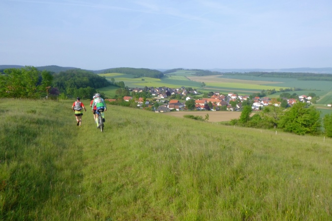 Ruhige, verschwiegene Trails, nur selten begangen und allenfalls nur verwegenen Eingeborenen bekannt, führen uns durch eine fantastisch schöne Gegend. Die Aussichten sind einfach umwerfend. Sowas schönes ahnt ja keiner, der auf der A7 zwischen Göttingen und Northeim daher brettert. Von dort sehen die Berge irgendwie unscheinbar aus… Aber sie haben was zu bieten, sportlich und auch kulturell. Seit gut 1000 Jahren gibt es Burgen und Wege, schnucklige Orte, Sagen und Legenden…