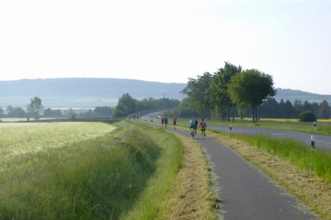 Hillerse, der Startort, liegt mitten im Tal, gar nicht weit weg vom Fluss. Auf einem Kartoffelhof ist Treffpunkt, daneben liegt ein Sportplatz mit Parken und Duschen sehr günstig für uns. Um 7:30 pünktlicher Start von 10 kleinen Läuferlein für den Lauf mit 65 km und 1700 Höhenmetern, Zeitlimit 11 Stunden. Natürlich gibt’s vorher noch das große Foto. Alles schläft noch, nur ein paar Wachhunde sind wegen uns total aufgeregt. Wir queren die Leine und die Bahn, um langsam ansteigend in den östlichen Hügeln zu verschwinden. Weiße Pfeile mit LU, teilweise verwegen versteckt, weisen uns den Weg, manchmal besser als die GPS-Geräte. Auch eine (grobe) Karte hilft nicht immer. Zum Verlaufen gibt’s reichlich Gelegenheit und wir nutzen sie auch fast alle, merken es aber bald und finden auf den Pfad der Tugend zurück.