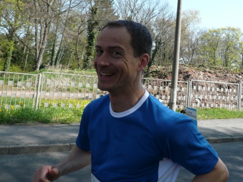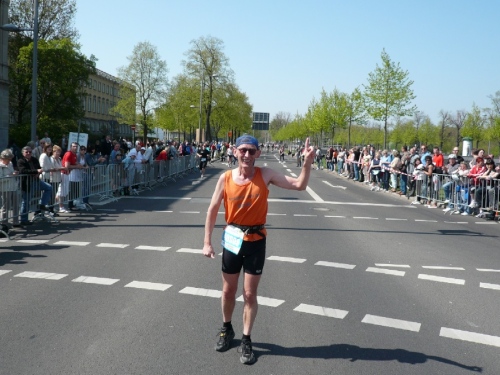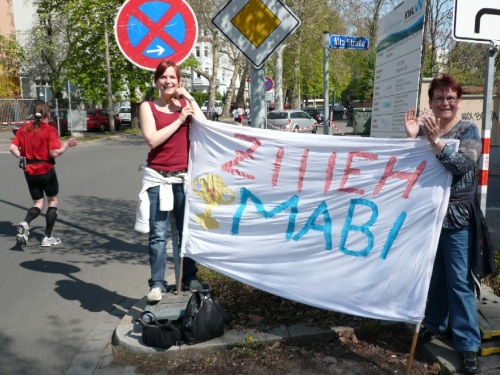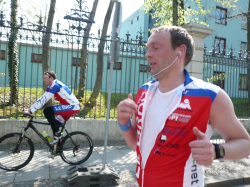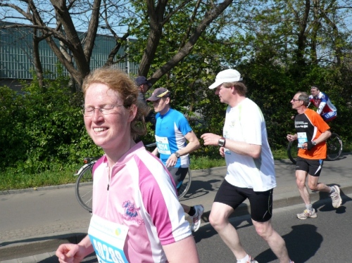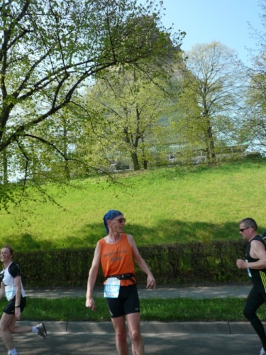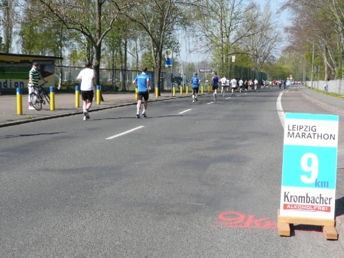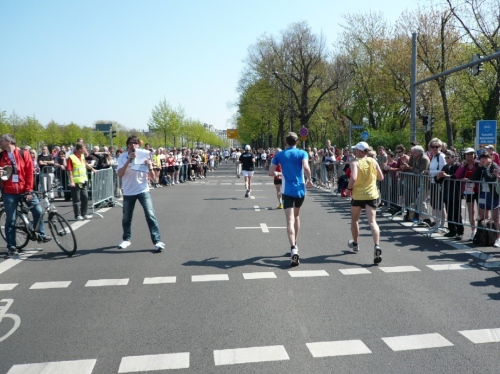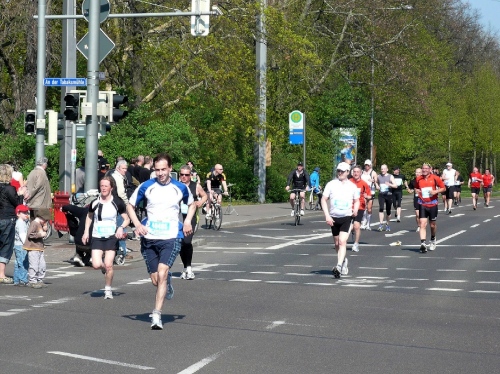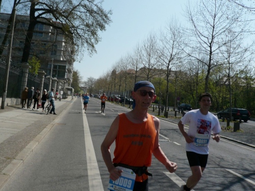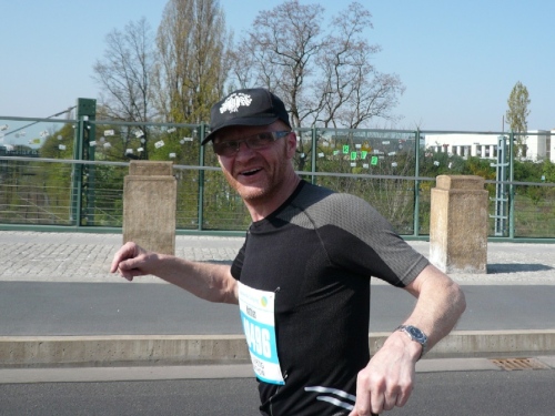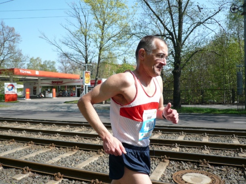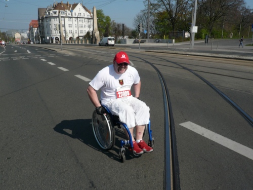 Matthias Birke ist der Nächste. Er war in Altenburg mein Begleiter für ein paar Kilometer. Heute will er den ganzen Marathon laufen. Im Gespräch noch mit Matthias überholen wir einen der Rollis. Christian Junge versucht, mit einem herkömmlichen Rollstuhl seinen Wettkampf zu bestreiten. Wenn man die anderen Rollis mit ihrem Hightech-Geräten gesehen hat, mir tut der Christian jetzt leid. Aber er wird sich in gut 2,5 Stunden durchbeißen.