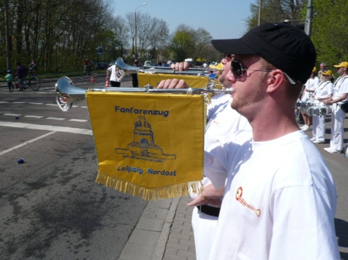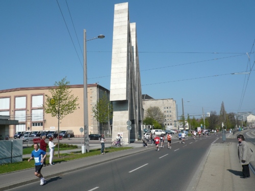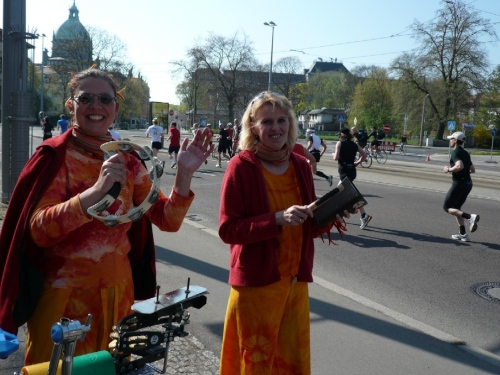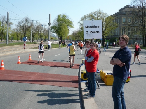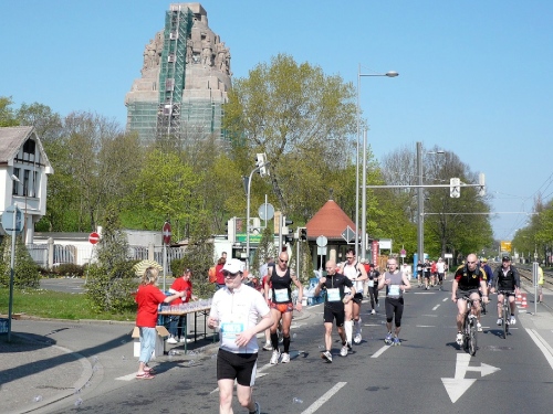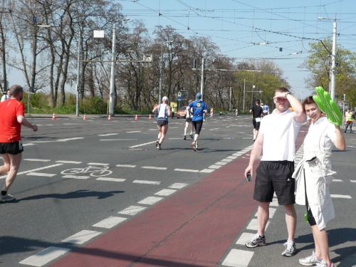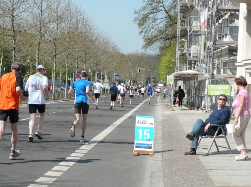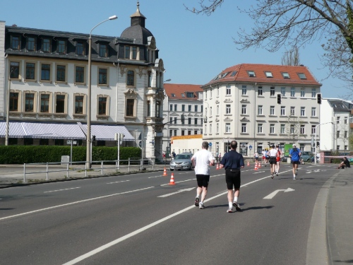 Wir biegen rechts in die Prager Straße ab und werden ein Stückchen Weges herunterreißen. Wie schaut es denn mit den Zuschauern aus: Wir finden zwar nicht den Zuspruch wie in Berlin oder Köln, aber die Sachsen kommen doch zahlreich an die Strecke. Gerade bei Kreuzungen und bei den Musikgruppen finden sich viele Leute ein. Ein älteres Pärchen beobachte ich. Er mit einer Ratsche, sie klatscht die Hände und schüttelt diese dann. „Vom Applaudieren tun die Hände weh. Dann lieber Laufen,“ so mein Statement. Sie lacht. Mittlerweile steigen die Temperaturen. Einem Besuch in einem Biergarten würde ich jetzt nicht ablehnen.
