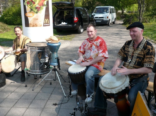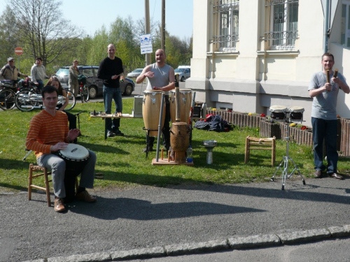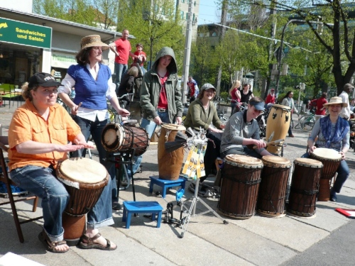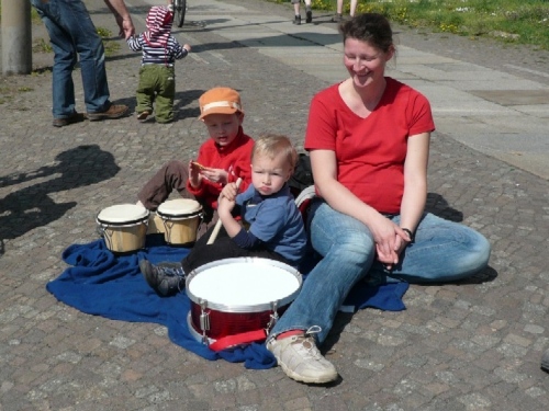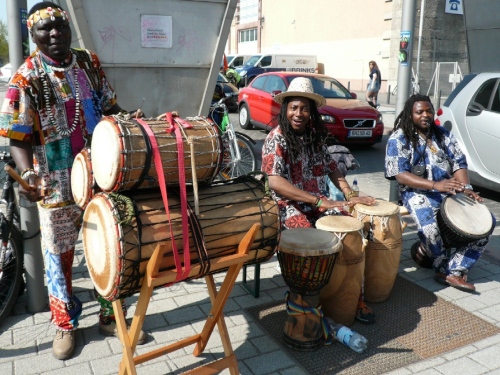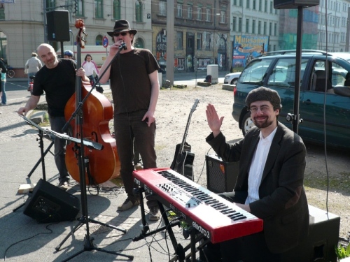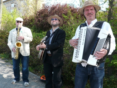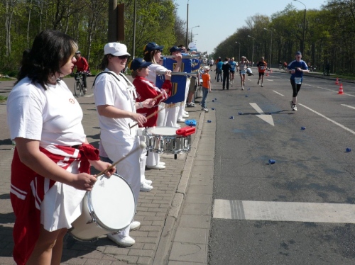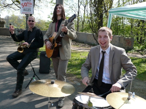 Erste Musik sehe ich in der Friedrich-Ebert-Straße. Die Spieler brauchen noch ein wenig Anlaufzeit, denn musikalische Töne höre ich nicht. Wenigstens hebt einer die Hand. Kurz danach beginnen sie ihr Spiel, ich kann es gerade noch hören. Ein Wort zur Musik. 12 Musikgruppen mit insgesamt 70 Personen finden wir auf unserer Stadtbesichtigung. Und da der Marathon auf einer 21-Kilometer-Strecke ausgetragen wird, kommen wir zwei Mal bei den Musikern vorbei.