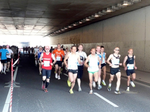 Es geht kurz in einen Tunnel, wo am Ende die Wende ist. Die Führenden haben auf den wenigen Metern schon einen guten Vorsprung herausgelaufen. Ich habe alle Mühe, ein brauchbares Bild zu bekommen.