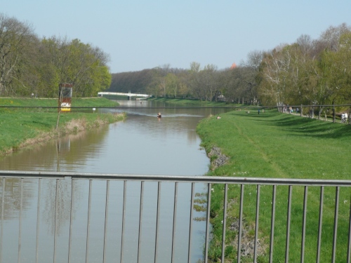 Es dauert nicht mehr lange, dann sehe ich das doppelte M der Alten Messe und dahinter das Völkerschlachtdenkmal im Gegenlicht. Seit 1996 wird das Gelände der Alten Messe in ein Gewerbegebiet umgewandelt. Als Nutzung hat man Wissenschaft, Medien, Entertainment und andere Gewerbe vorgesehen. Ich komme in diesem Bereich kurz mit Frauke Reuter ins Reden. Ihr ist es zu warm. „Trinken und Kühlen,“ mein Ratschlag. Ich lasse sie dann hinter mir.
