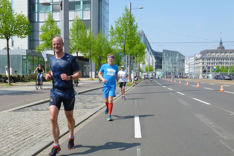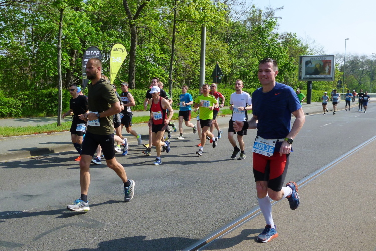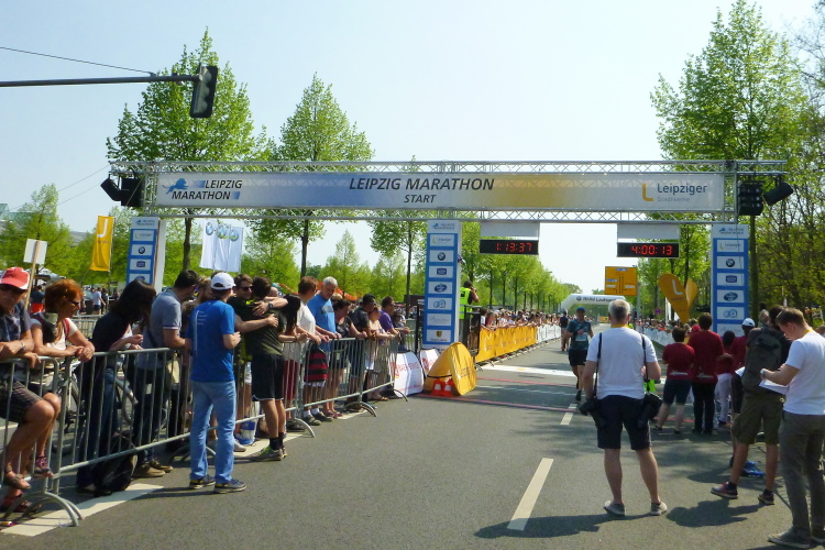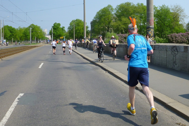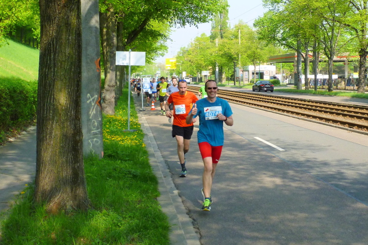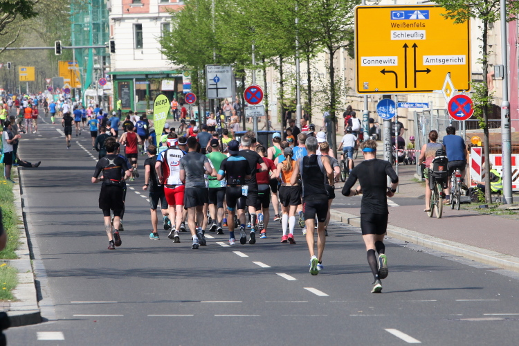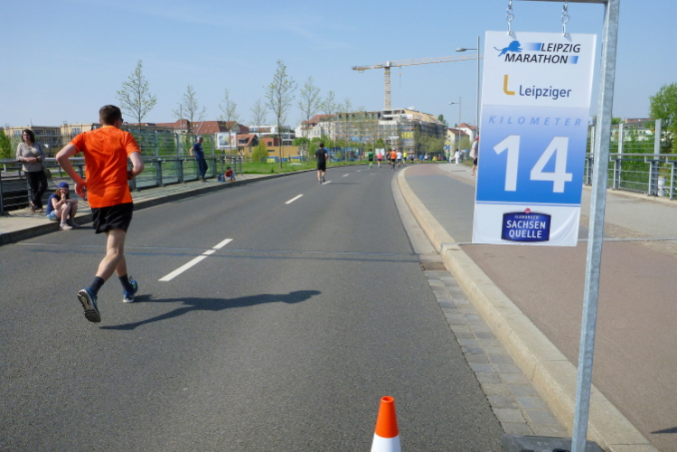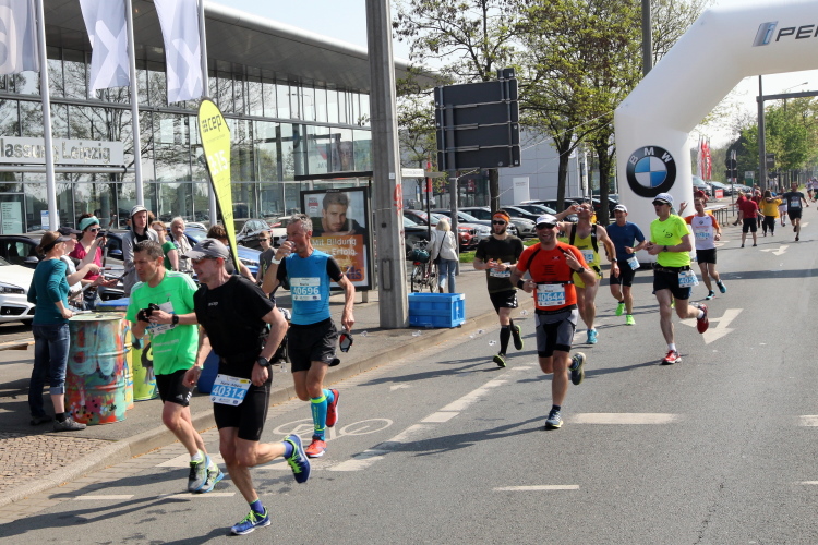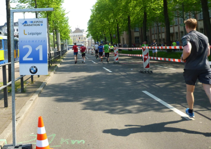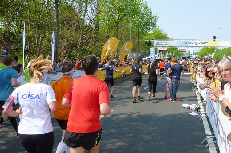Noch eine Rechtskurve, dann sind wir auf der Bowmanstraße, wo ich links auf den Festplatz ein Volksfest sehe. Viele Leute stehen an der Brücke, die über das Elsterflutbett führt. Die Zielmoderation auf der Jahnallee ist schon zu hören. Aber wir laufen nicht in die Jahnallee, sondern rund 200 Meter weiter, wo wir am Waldplatz wenden. Knapp unter zwei Stunden, die zweite Runde kann kommen. Die Vier-Stunden-Gruppe sehe ich am Ende des Wendestückes. Zehn, zwölf Leute hängen dran, noch. Ein gutes Omen für meinen Plan sub vier.
