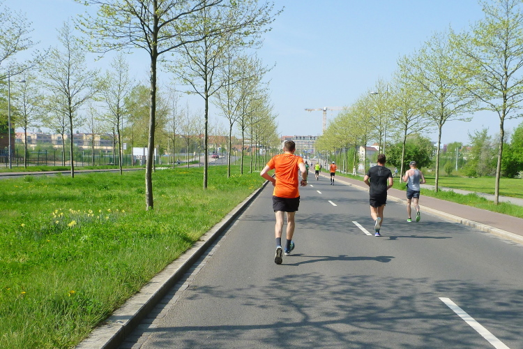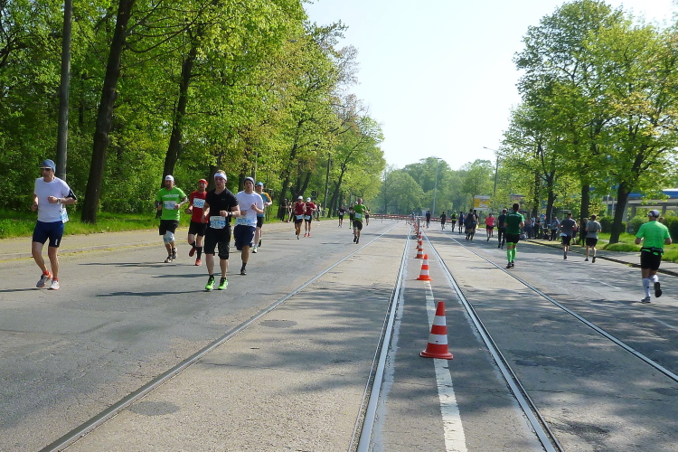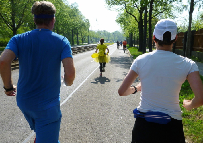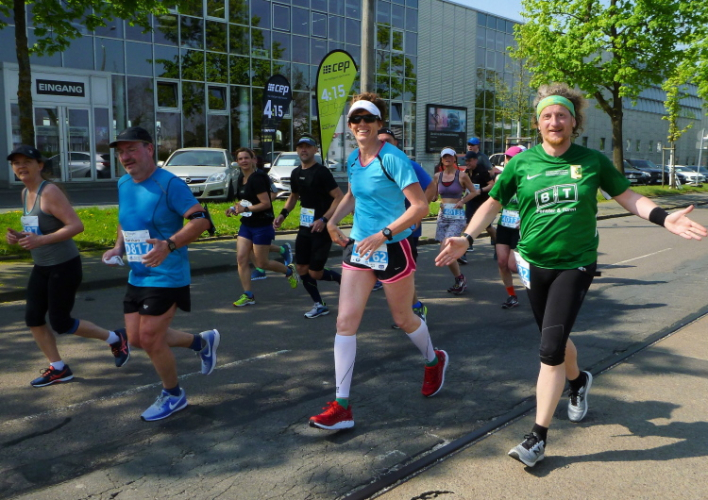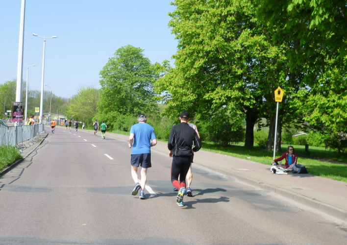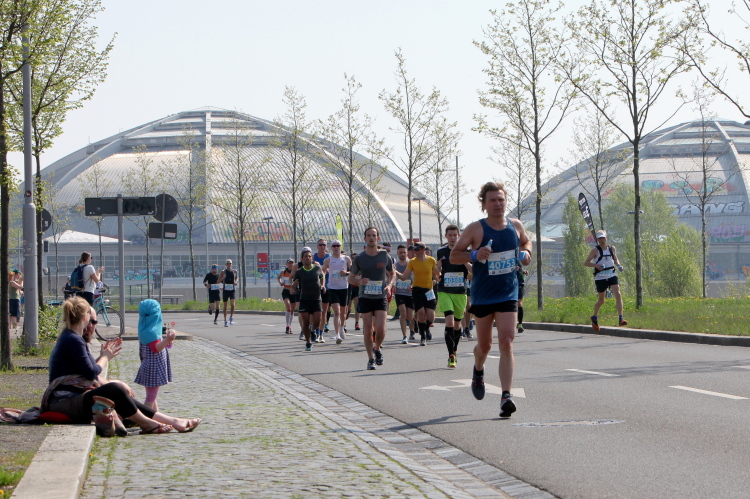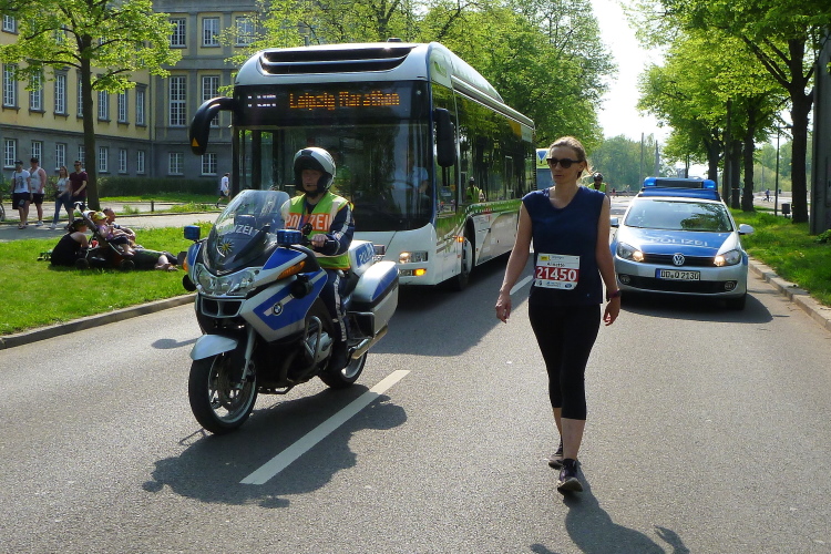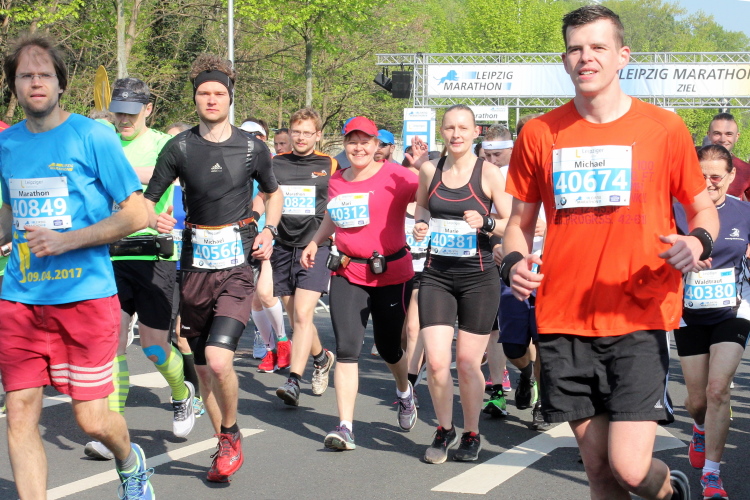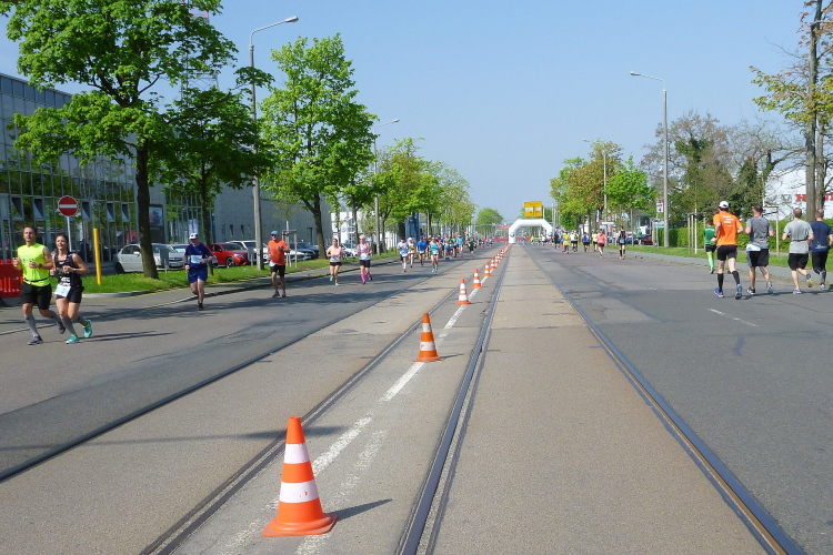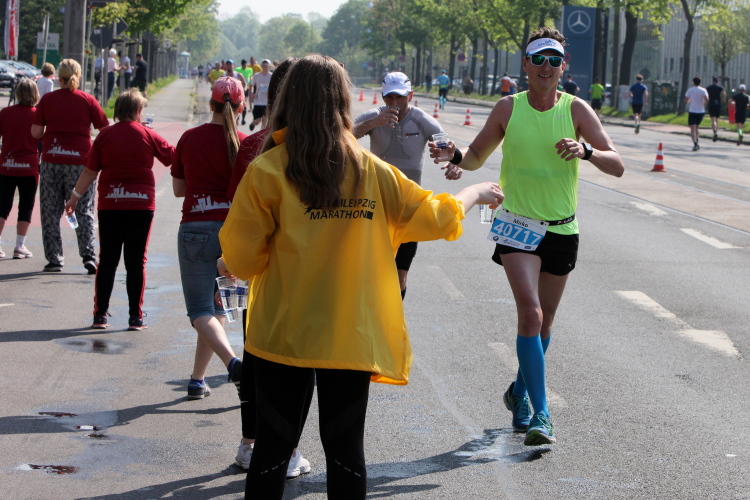 Noch eine Rechtskurve, dann sind wir auf der Bowmanstraße, wo ich links auf den Festplatz ein Volksfest sehe. Viele Leute stehen an der Brücke, die über das Elsterflutbett führt. Die Zielmoderation auf der Jahnallee ist schon zu hören. Aber wir laufen nicht in die Jahnallee, sondern rund 200 Meter weiter, wo wir am Waldplatz wenden. Knapp unter zwei Stunden, die zweite Runde kann kommen. Die Vier-Stunden-Gruppe sehe ich am Ende des Wendestückes. Zehn, zwölf Leute hängen dran, noch. Ein gutes Omen für meinen Plan sub vier.