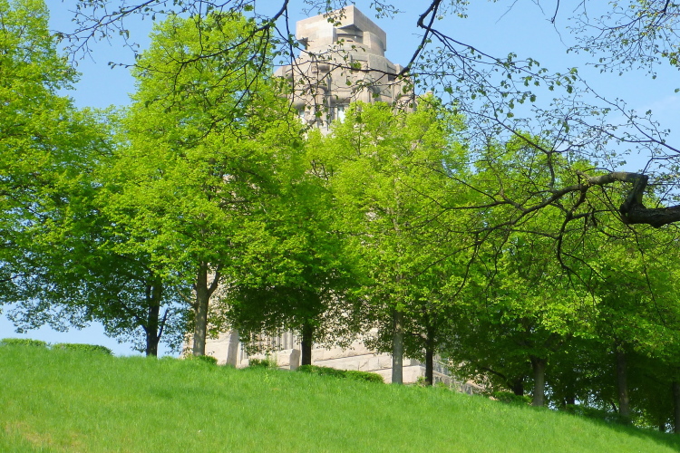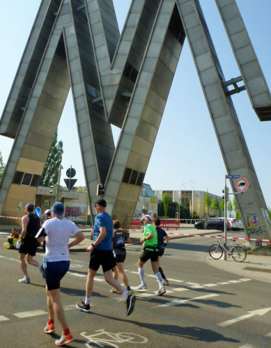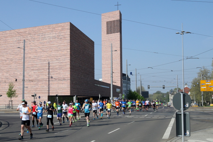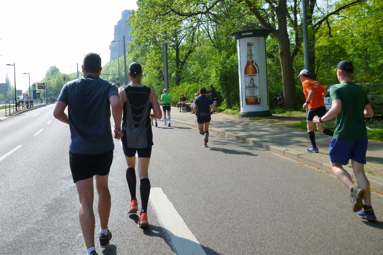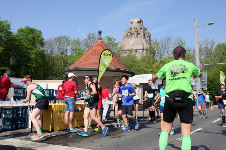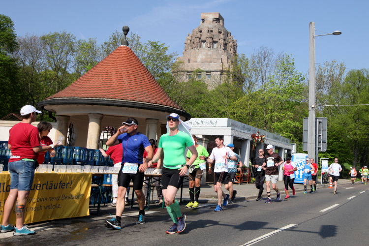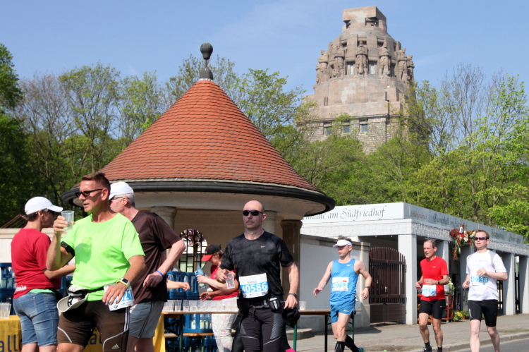 In Laufrichtung sehe ich schon die Kontur des Völkerschlachtdenkmals. Nach einem Entwurf des Architekten Bruno Schmitz wurde der 91 m hohe Bau im Jahr 1913 eingeweiht. Es zählt zu den bekanntesten Denkmälern Leipzigs, vergleichbar mit dem Kyffhäuser- oder dem Hermannsdenkmal (fällt mir ein, weil es dort auch Läufe gibt), und soll an die Völkerschlacht (16. bis 19. Oktober 1813) der Franzosen unter Napoleon auf der einen Seite und den Österreichern, Preußen, Russen und Schweden auf der anderen Seite erinnern. Schauen wir mal, wie wir uns schlagen auf den 42,195 Kilometern. Noch geht alles leichtfüßig, auch wenn die Temperaturen steigen.