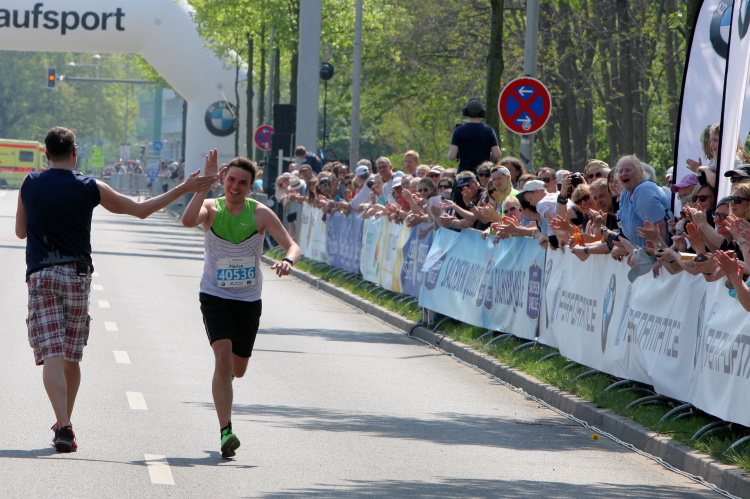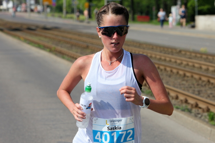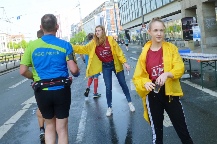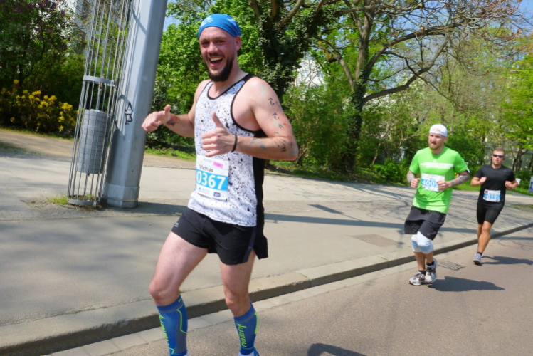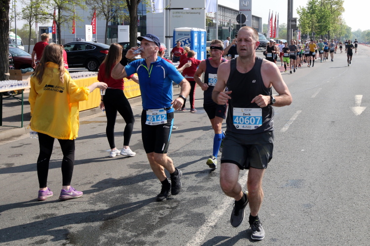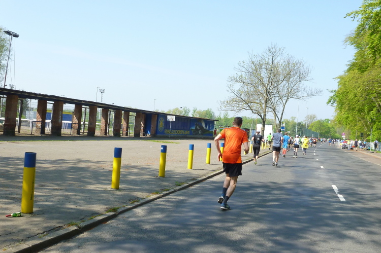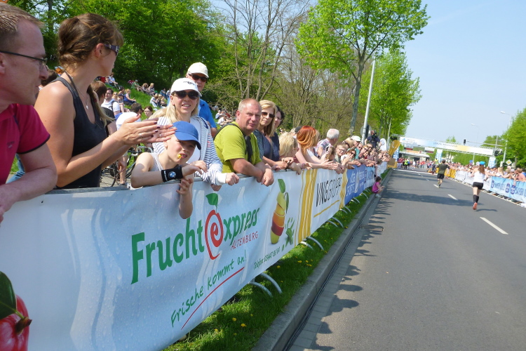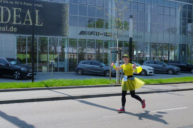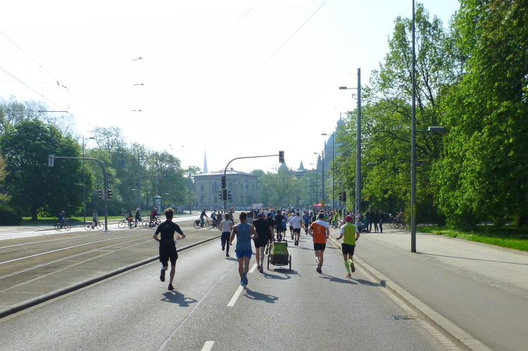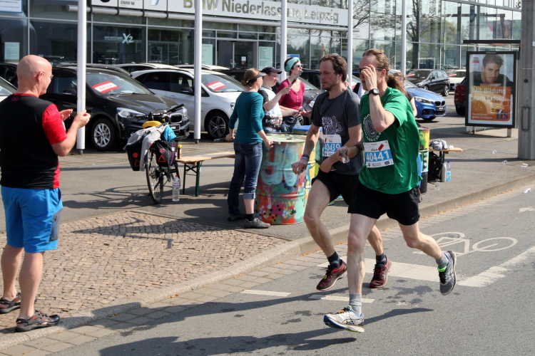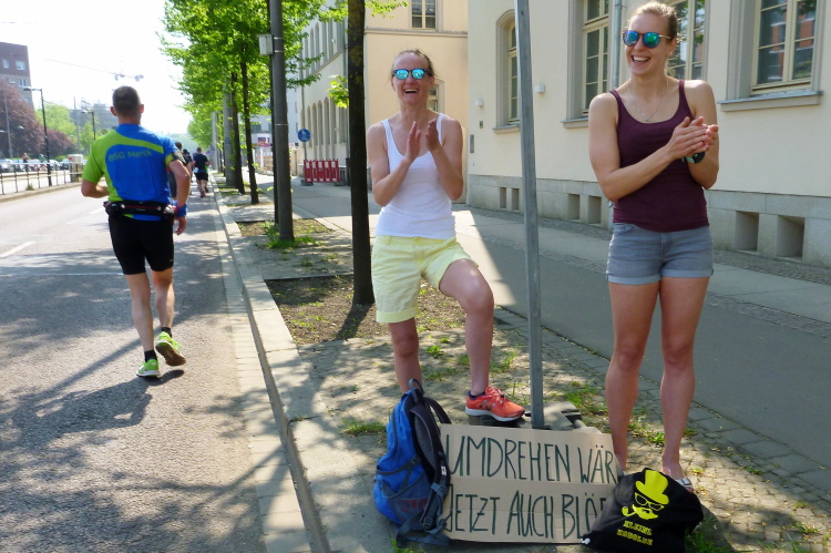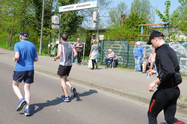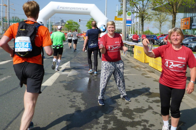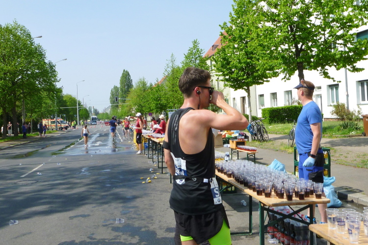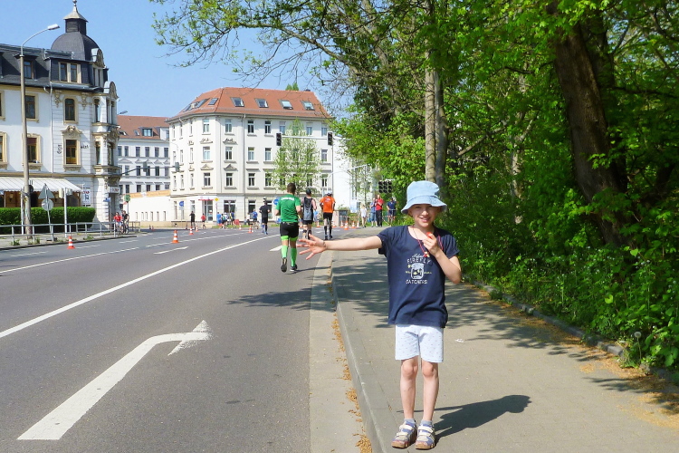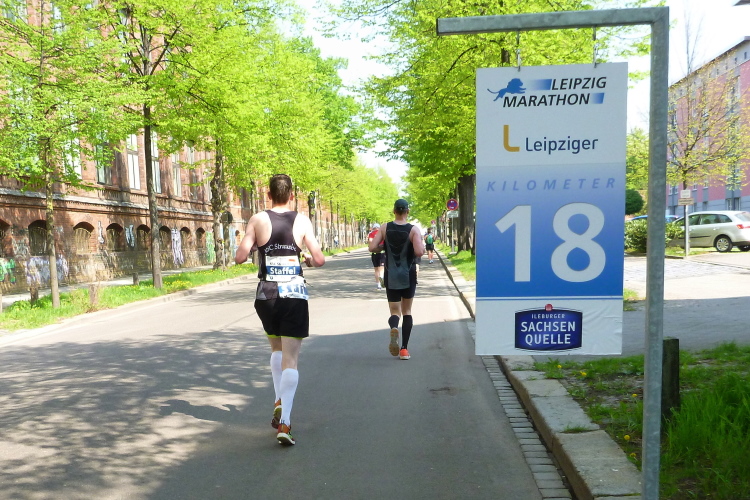 Kurt-Eisner-Straße, Kilometer 15. Im Wohngebiet feiern die Anwohner die Marathonis. Kinder fahren mit ihrem Bobbycars und Treckern auf der Seite, die Leute klatschen und sprechen fast jeden an, inklusiv Abklatschen. Das macht richtig Spass und Lust auf die zweite Runde. Vom Biergarten der Gaststätte Südvorstadt her riecht man Grillwürste und Grillfleisch. Mir knurrt der Magen. Dafür gibt es später wieder Bananenstückchen.