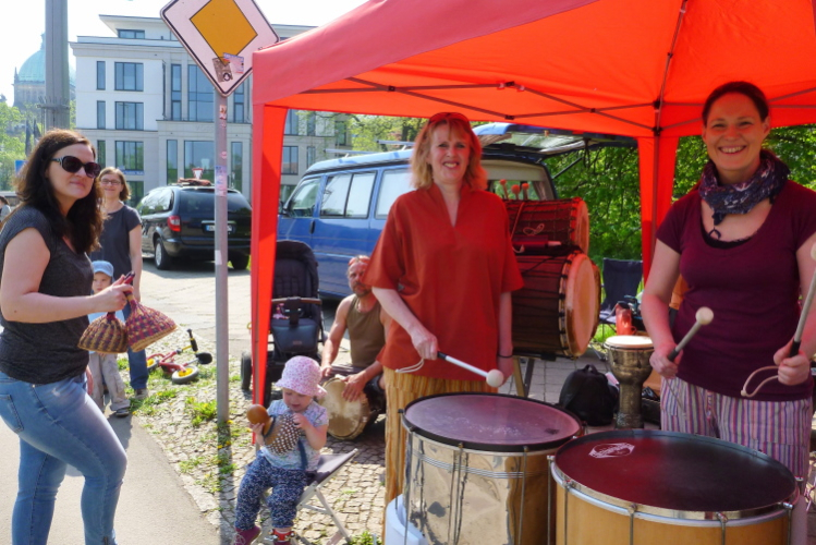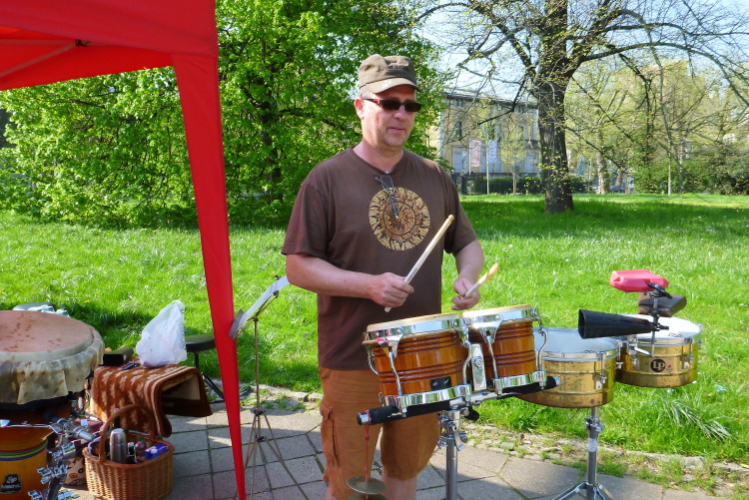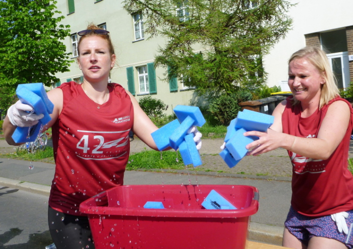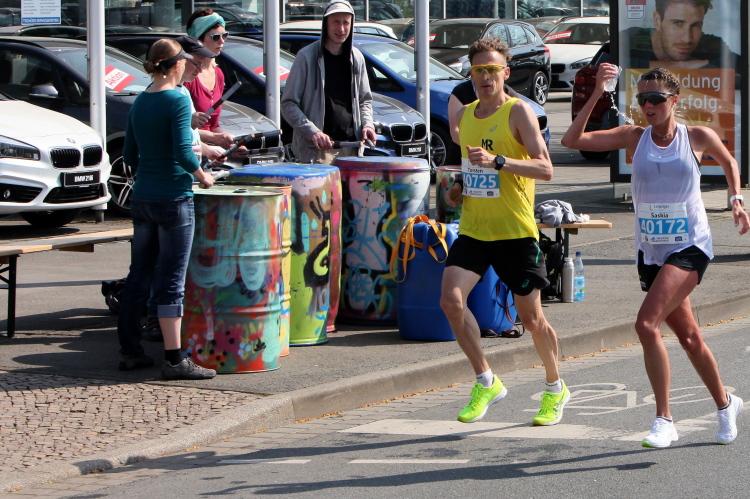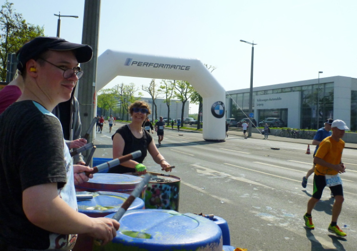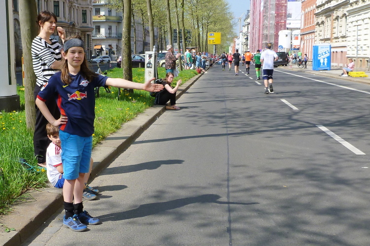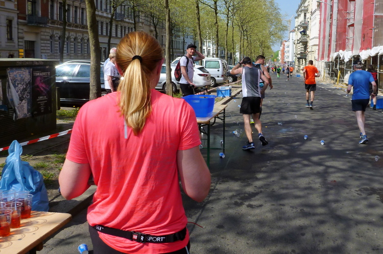 Ein paar Meter weiter, jetzt in der Probstheidaer Straße, feiern Anwohner eine Marathonparty auf ihre spezielle Art. Frühstück an der Strecke, einer bedient zur Freude der vorbeilaufenden Marathonis den Wasserschlauch, andere Zuschauer geben den Lauftakt mit Schöpfkelle und Kochtopf vor. Das ganze unter einem Sonnensegel.