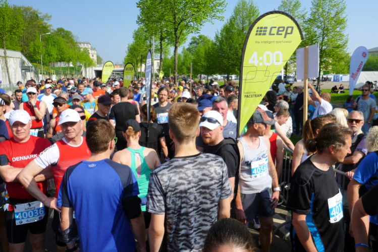 Dann werden wir aufgerufen, uns aufzustellen. Die Zugläufer (ab 3.00 Stunden bis 4.45 Stunden) verteilen sich im Feld. Ich platziere mich zwischen den 3.45er und 4-Stunden-Pacern, wissend, dass es heute wohl wieder an die vier Stunden hingehen wird, vielleicht auch drüber.
