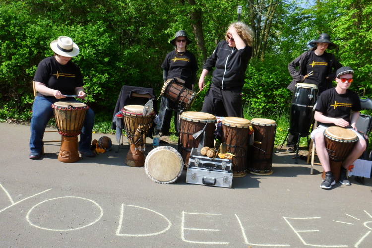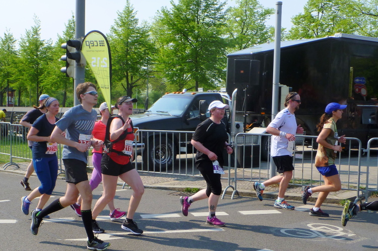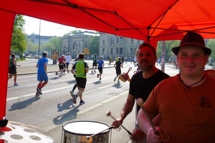 Mittlerweile kann ich frei laufen und muss nicht mehr so sehr aufpassen, wenn ich zum Fotografieren stehenbleibe. Das Feld hat sich deutlich entzerrt. Die Stimmung ist klasse, die vielen Musikgruppen auch. Eine Sambaband hat sich in der Grünfläche niedergelassen und unterhält uns im rhythmischen Takt. Da kommt die erste Wasserstelle nach 2,5 Kilometer gerade recht. Die ersten Läufer schütten sich das Aqua schon über den Kopf. Ich ziere mich (noch).