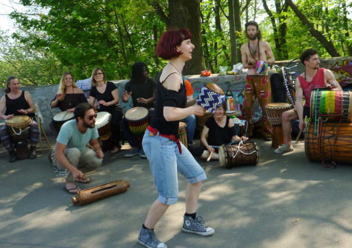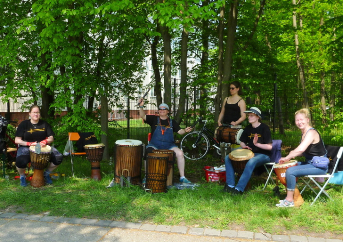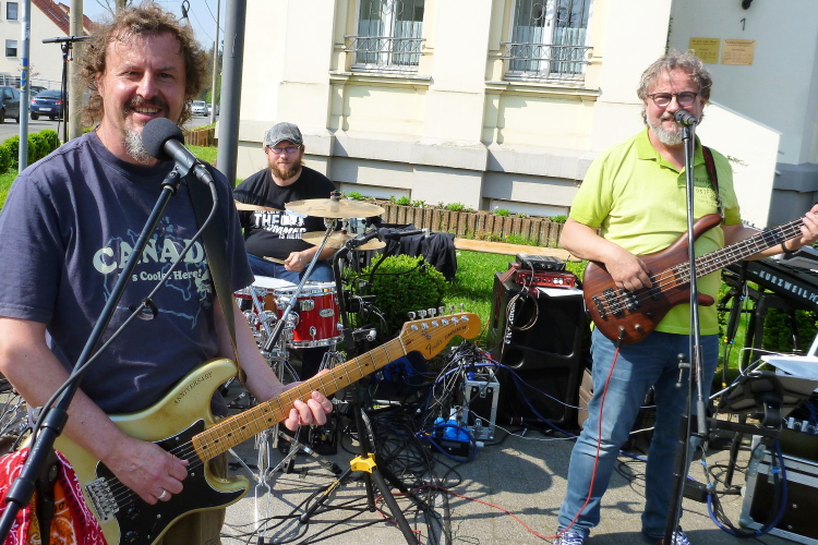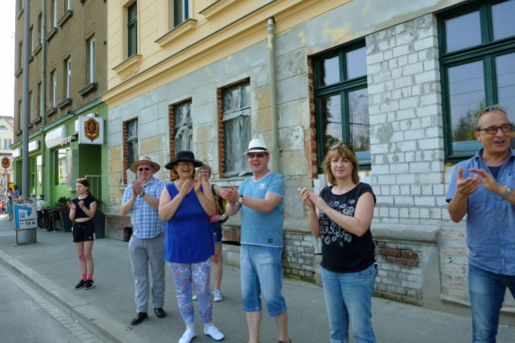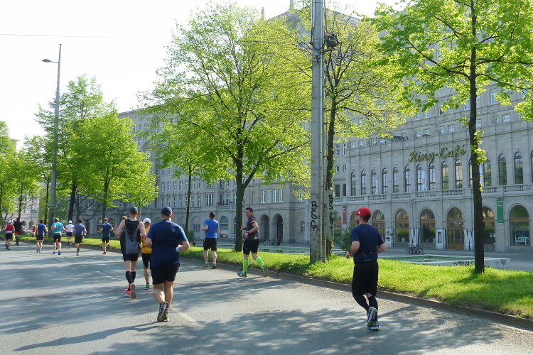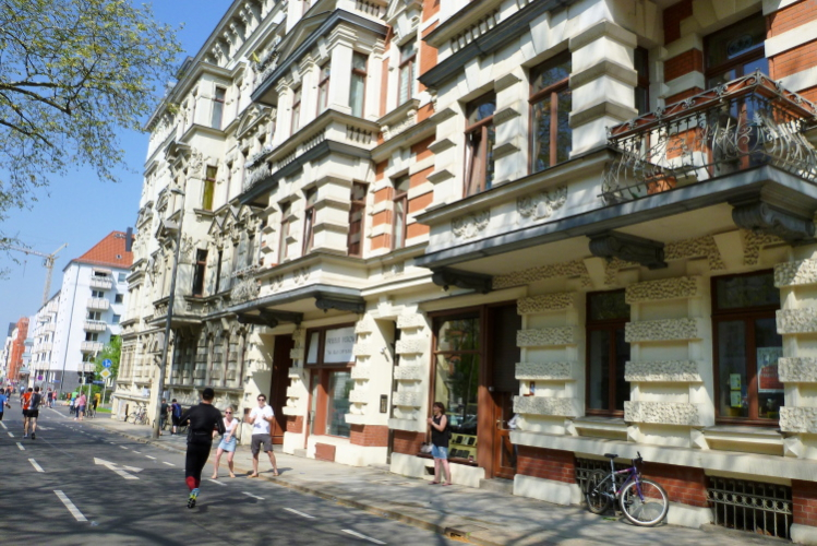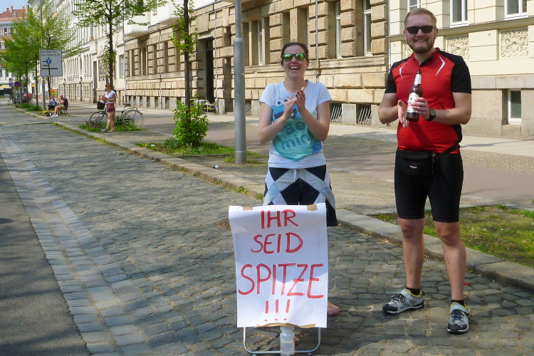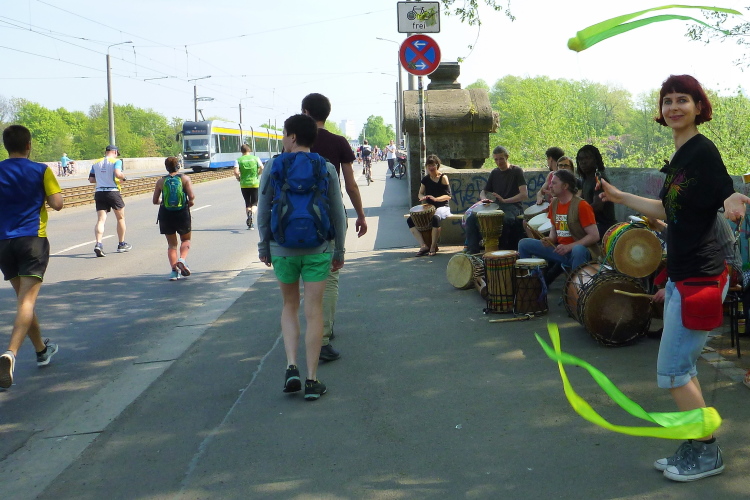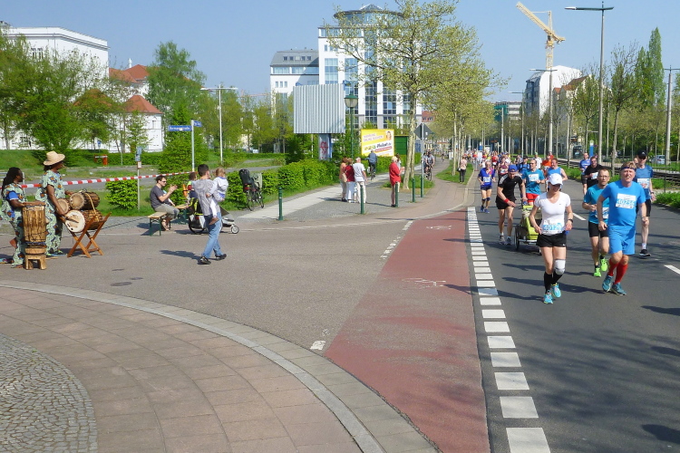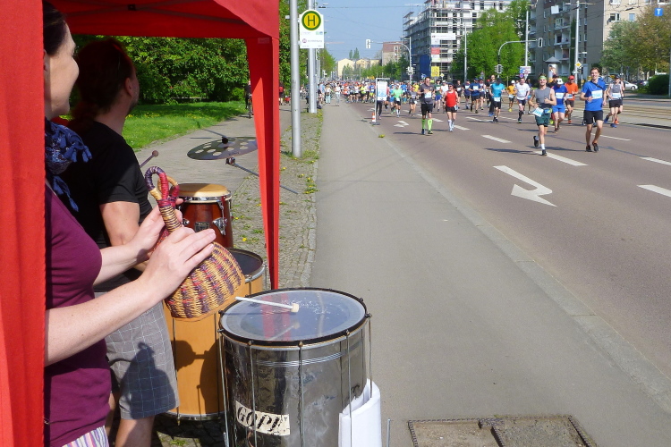 Etwa fünf Kilometer sind wir entlang der Prager Straße gerannt, die wir dann im Stadtteil Probstheida nach rechts verlassen. Ein paar Bewohner machen Stimmung vom Balkon, mehr Zuschauer lockt dann eine Rockband an, die sich anfangs der Connewitzer Straße postiert hat.