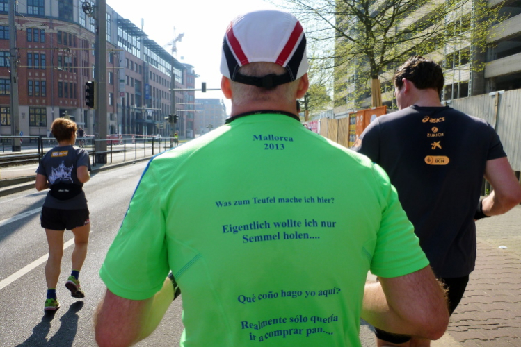 Umdrehen wär jetzt auch blöd, lese ich einen Kilometer weiter. Die Mädels lachen, als ich auf das Schild deute. Erik Mocker, der als „Incredible Alcs“ unterwegs ist, schwitzt schon gehörig. Er ist klüger als ich, denn er hat ein paar Groschen eingesteckt - für Schwarzbier, wie er meint. Ich werde wohl nüchtern bleiben. Mittlerweile kommen die Staffeln von hinten. Die sind mit einem Zeitverzug von 20 Minuten gestartet. Vier Personen bilden ein Team.