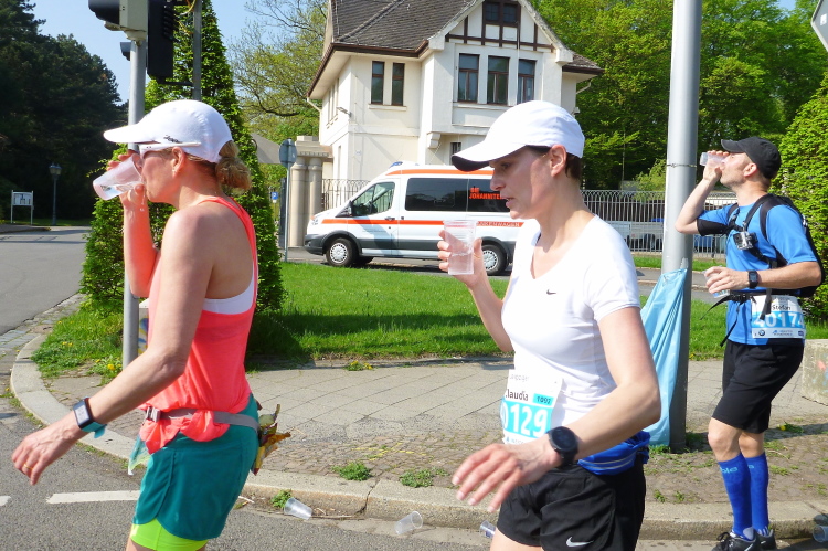 Nach dem Völkerschlachtdenkmal sehen wir das Brauhaus Napoleon, das der französische Feldherr als Generalstabsquartier im Jahr 1813 benutze. Die Stimmung unter den Leuten bleibt klasse. Der bärtige Sänger der Gruppe an der Ecke zur Connewitzer Straße springt mir gleich ein paar Meter nach. Mittlerweile bleiben fast alle Läufer bei den Wasserstellen stehen. Ich werfe mir ein Gel ein, das bringt neue Kraft. Wichtig ist, dass die Wärme vom Körper weggebracht wird. Die einen schütten sich das Wasser auf den Kopf, andere gießen sich das Nass hinten auf den Rücken und mache tauchen gleich ihre Rübe in die Wasserbecken. Die Feuerwehrkameraden bei Kilometer 32 haben einen Hydranten angezapft und einen C-Schlauch an die Strecke verlegt, wo man auf Zuruf einen gescheiten Strahl auf die Brust bekommt. Kinder stehen immer wieder mit ihren Wasserpistolen an der Strecke und haben eine Freude, wenn sie auf uns mit Wasser zielen dürfen. Das tut gut.