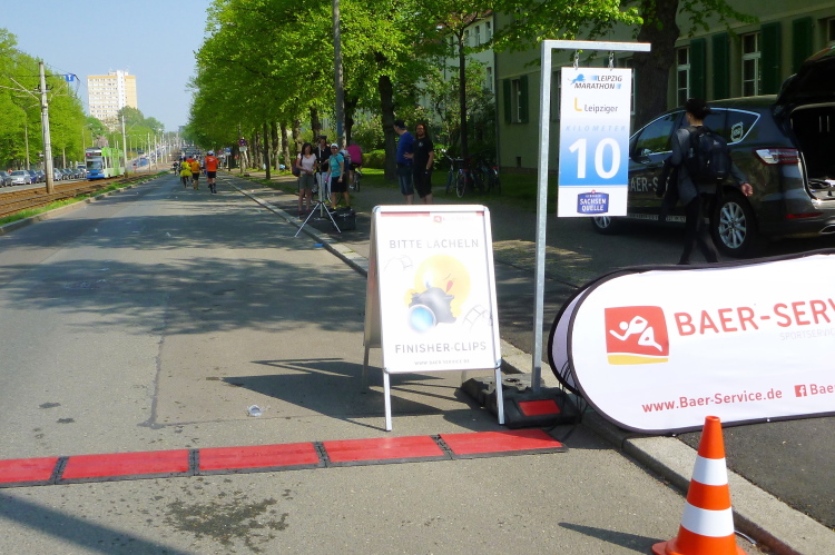 Nun zieht sich der Kurs, aber nur noch einstellig sind die Restkilometer. Die Zuschauer suchen mittlerweile auch den Schatten auf, so wie die zwei Hübschen, die eine Stoffplane über ihre Räder geworfen haben und nun drunter hervorlugen. Dann sehe ich einen Bekannten von vorne, Jens Körner. „Ich bin platt“, sagt er, und schickt mich weiter. „Dein Wille ist deine Grenze“, lese ich auf einem Schild. Auf der Elster sind einige Boote zu sehen, die haben nicht mit der Hitze zu kämpfen. Bei der nächsten großen Kreuzung steht ein Mitarbeiter der Leipziger Verkehrsbetriebe, korrekt angezogen mit einer Krawatte. „Ich könnt des net“, und deute auf den Schlips. Er lacht und meint, er können keinen Marathon laufen. Den Soldaten ist offenbar auch noch keine Anzugserleichterung erlaubt.