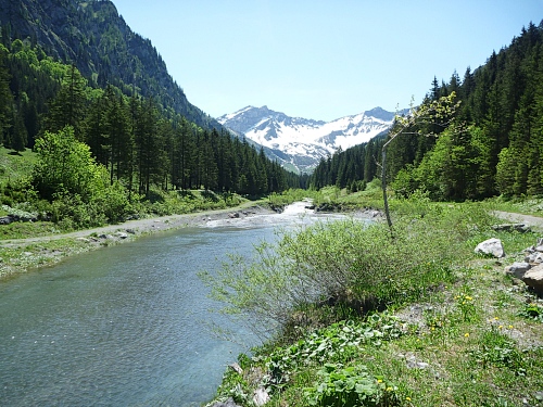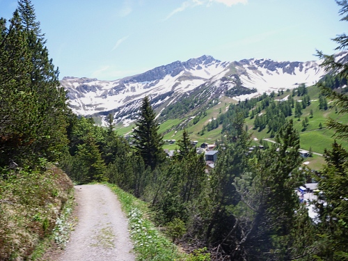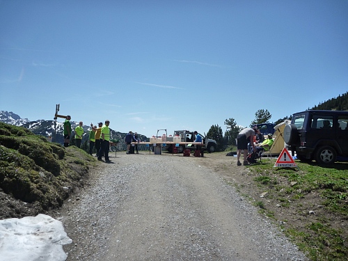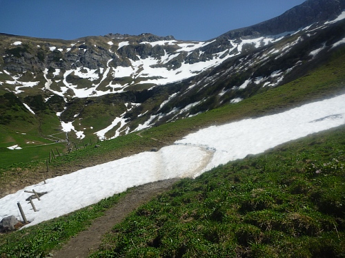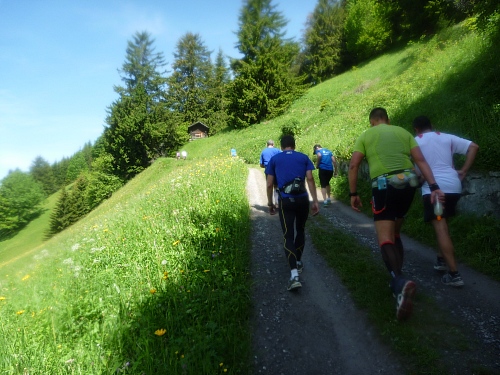 Für uns Marathonläufer geht es weiter ins Valorschtal. Großer Bogen weit um das Zielgebiet herum. Der Weg ist das Ziel, ist wunderschön und ziemlich warm. 26-29 Grad, auf den Schneefeldern aber traumhaft kühl.